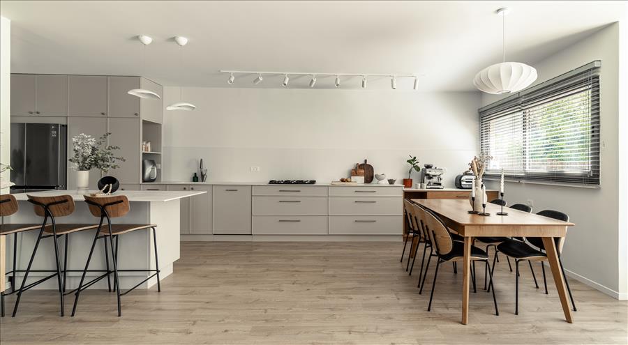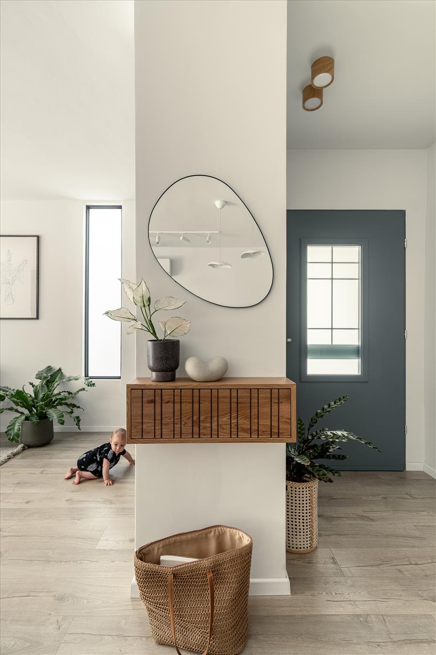 לבית נבחרה פלטת צבעים וחומרים מאוד עדינה, מוארת ומינימליסטית.