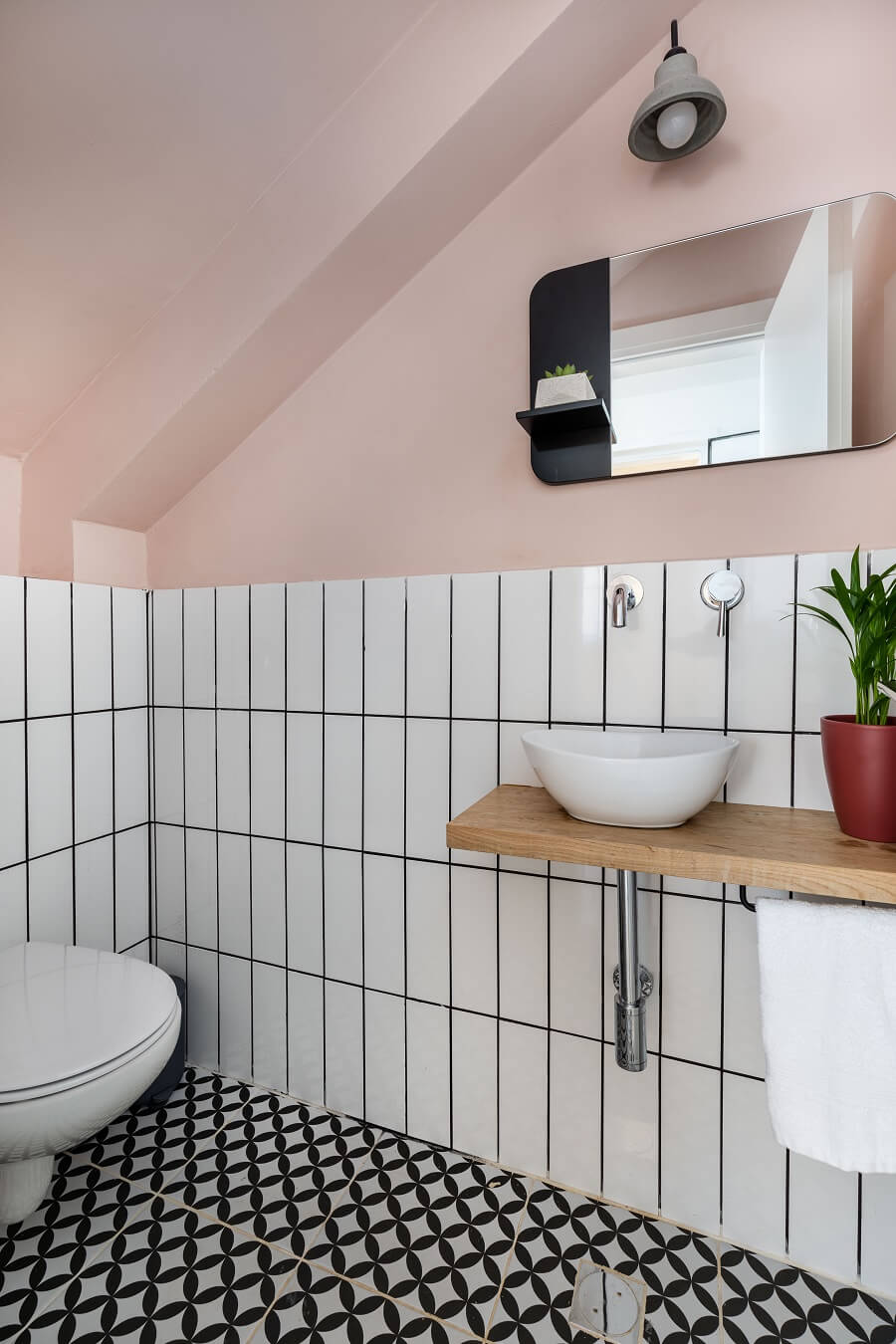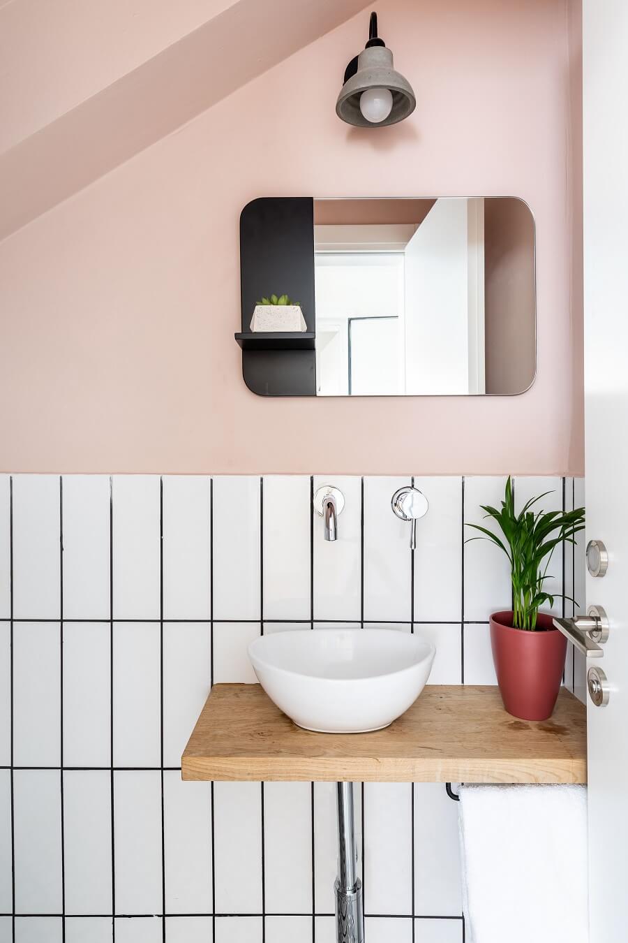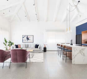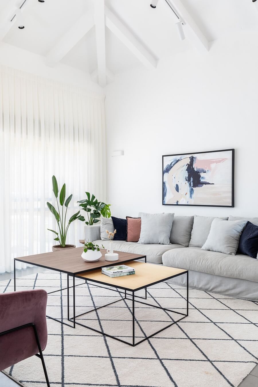 בחלל הציבורי תקרה גבוהה עם קורות עץ שבחרנו לצבוע בצבע לבן.