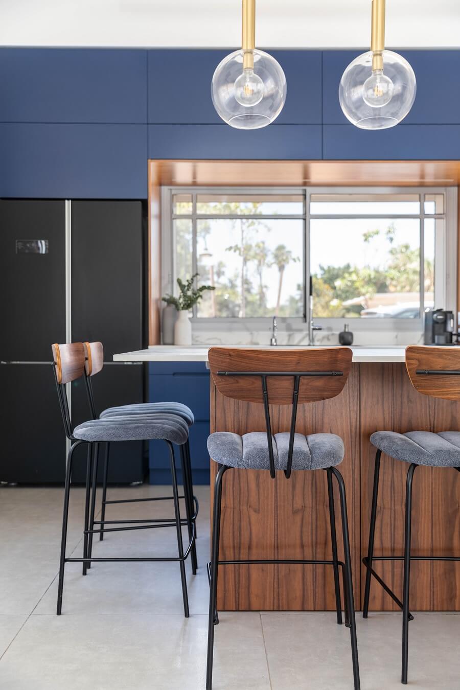 לב הבית הוא המטבח. החלטנו לוותר על פינת אוכל סטנדרטית ובמקומה תכננו אי במטבח שמשמש גם משטח עבודה וגם מקום ישיבה .