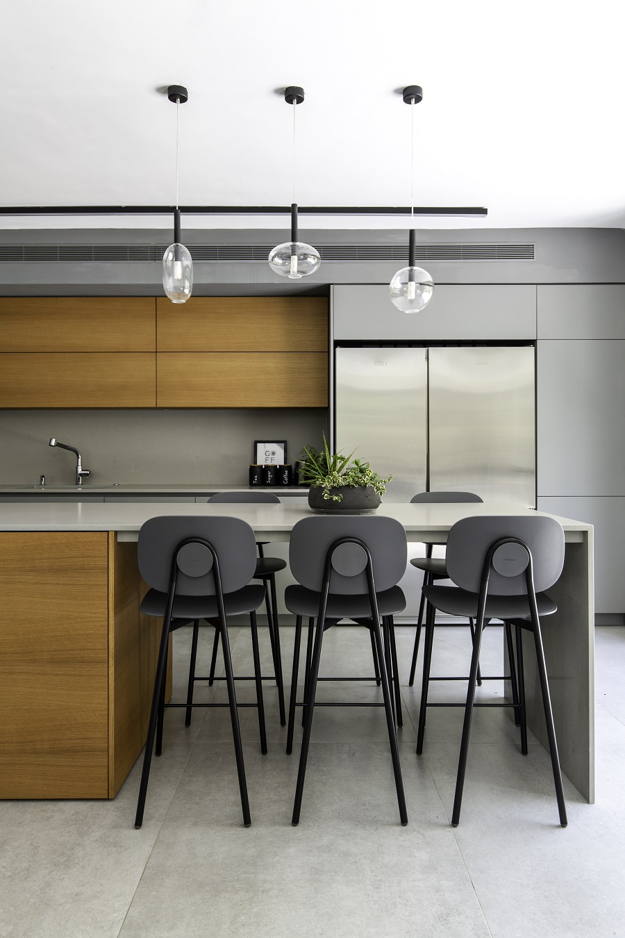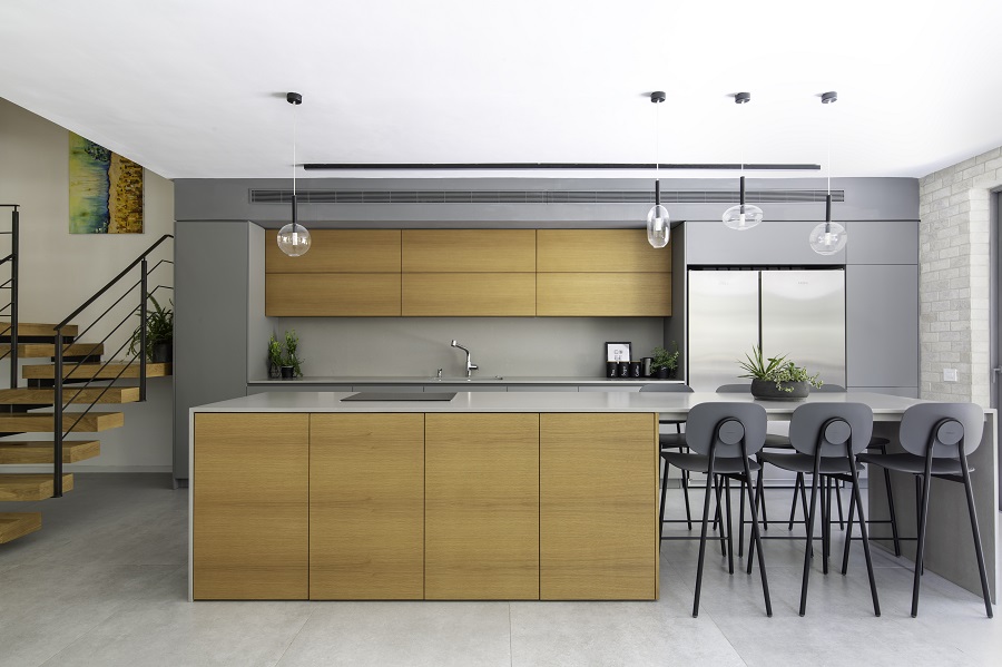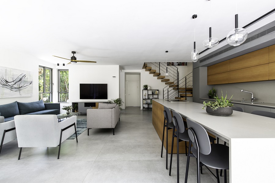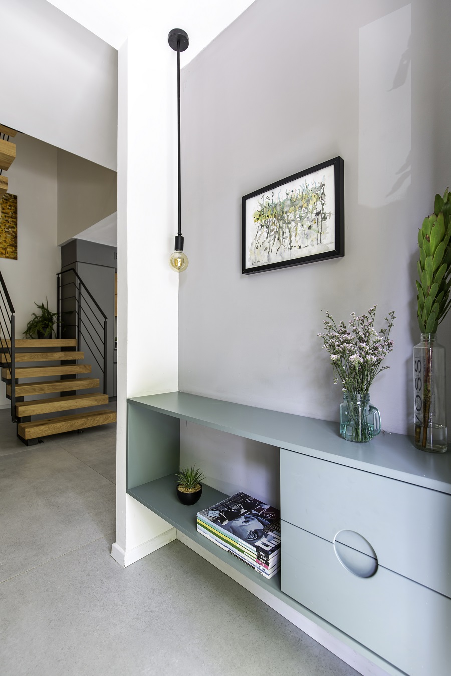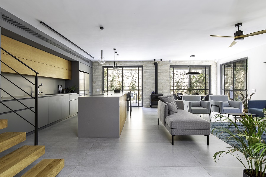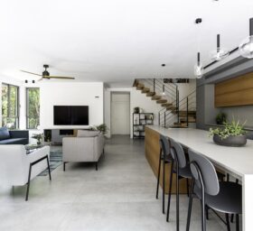 שיפוץ מלא לבית דו משפחתי עבור משפחה עם ארבעה בנים. השיפוץ כלל הגדלת הפתחים, תכנון חדש לחלל הציבורי, קיר המפריד בין המטבח לסלון פורק, מיקום המטבח הוחלף עם הסלון ליצירת מטבח 2 פסים רחב ידיים עם אי גדול המאפשר ישיבה לכל בני הבית. המדרגות לקומת המגורים פורקו והוחלפו במדרגות קלות. וכן שופצו גם החללים הפרטיים. הגוונים האפורים שולטים בבית ובהם הוכנסו זריקות צבע. לאווירה חמימה יותר, החזית הפונה לחצר חופתה בבריקים.