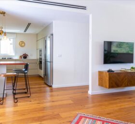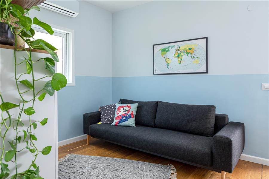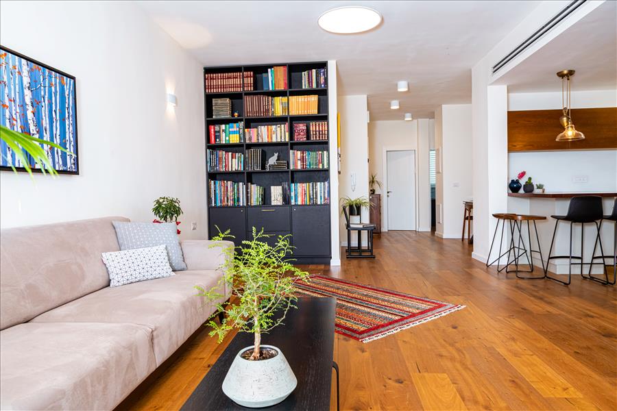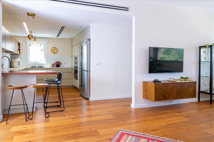 כל הבית רוצף בפרקט אלון תלת שכבתי – שנותן תחושה של מרחבים גדולים יותר מהקיים.