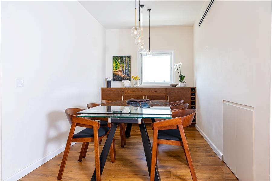 מצידו השני של הקיר ממוקמת פינת האוכל הרשמית שגם בה דאגנו לשידת אחסון עבור הכלי אירוח הרבים שיש לבעלת הבית שנוהגת לארח רבות.