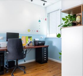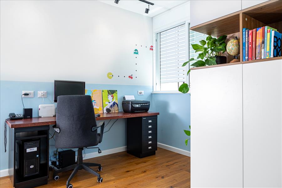 בחדר הזה מיקמנו שולחן עבודה גדול לבקשת הלקוחה, עם פלטת עץ אלון שהוזמנה ע"פ מידה מהנגרים שסיפקו את כל הנגרות בבית ואילו הרגליים מיחידות ברזל בצבע שחור שהוזמנו במיוחד ממדפי לה גרדיה.