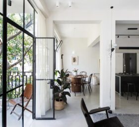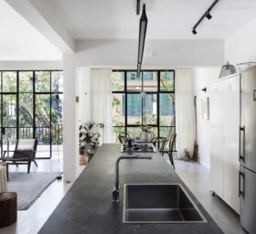 ויטרינות ישר וסלון גדול יותר, ועדיין היא נותרה שימושית ונעימה. קיר החלונות, בגובה שלושה מטרים, הוא מחולל האווירה המרכזי: הוויטרינות הן מקור האור והאוויר העיקרי, והן מעניקות תחושה שהסלון נמצא בתוך גן פיקוסים. את התחושה המוארת והאוורירית מחזקים רצפת מיקרוטופינג בגוון אפור בהיר מאוד וקירות בגוון לבן-שבור בגימור מט.