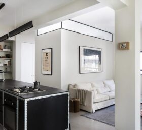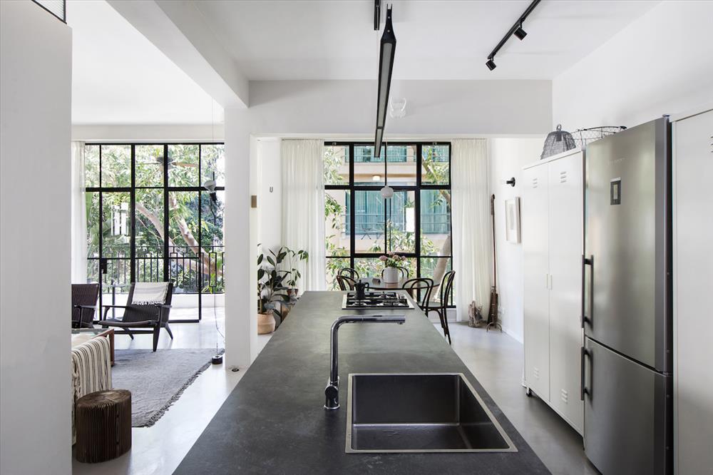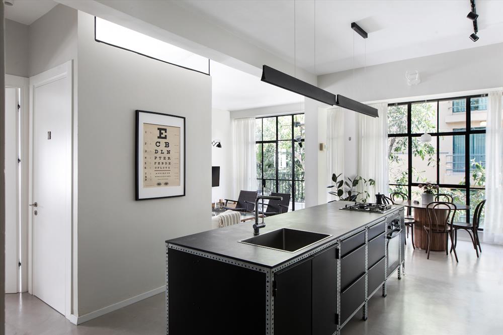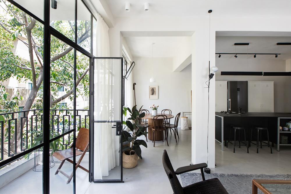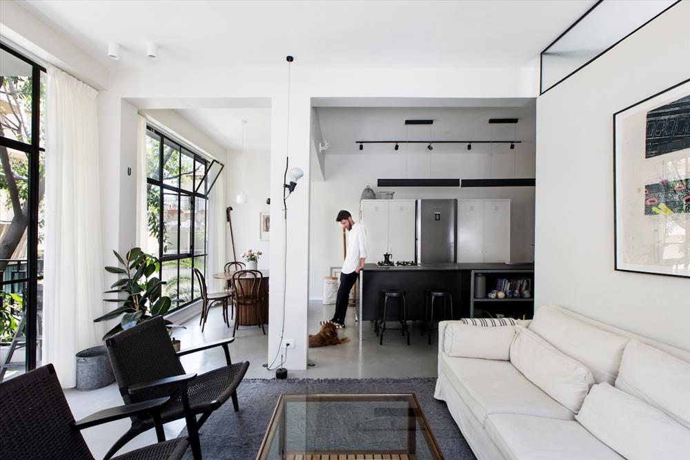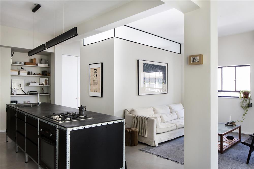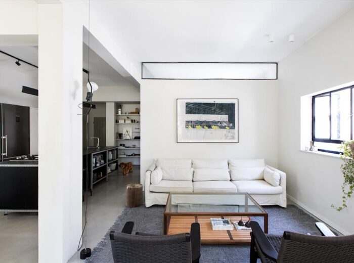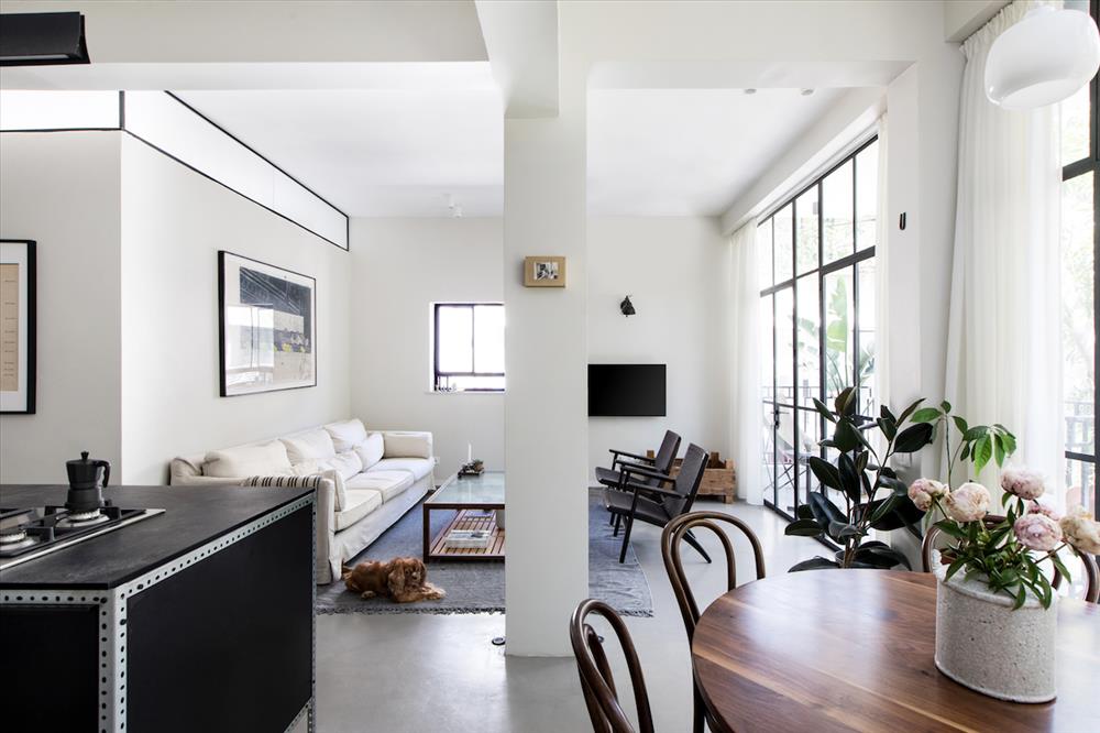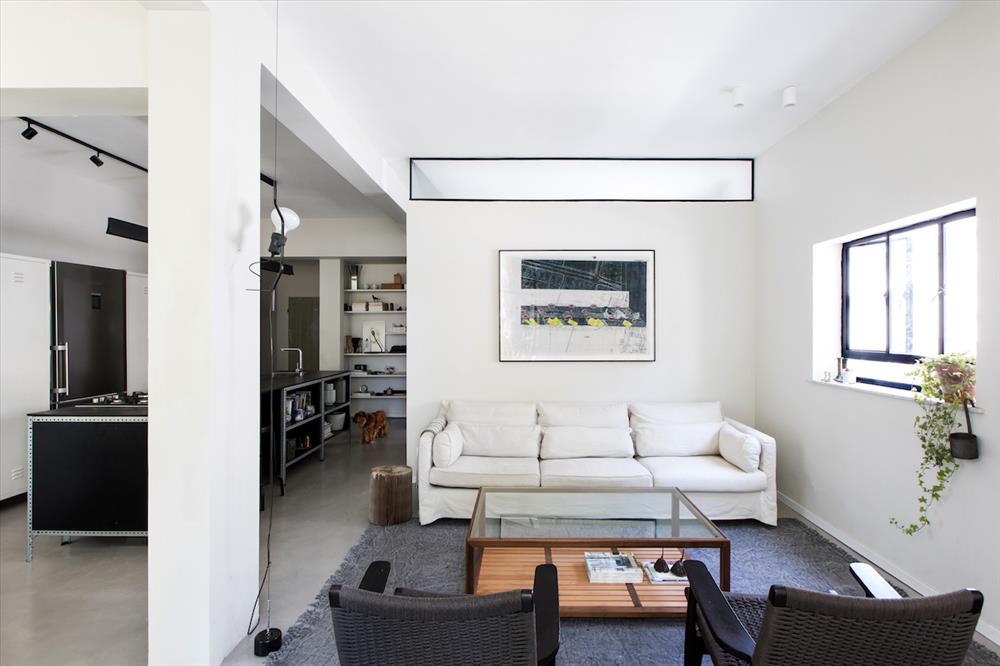 קורה אחרת, שנמשכת לכל אורך הדירה, יוצרת הפרדה חזותית בין פס המטבח ופינת האוכל לסלון, שניצב מול הוויטרינה השנייה, הנפתחת אל מרפסת. שטיח אפור כהה ממסגר על רצפת הבטון הבהירה את פינת הישיבה, למרגלותיו של חלון לא גדול (גם הוא ממוסגר בפרופיל בלגי שחור).