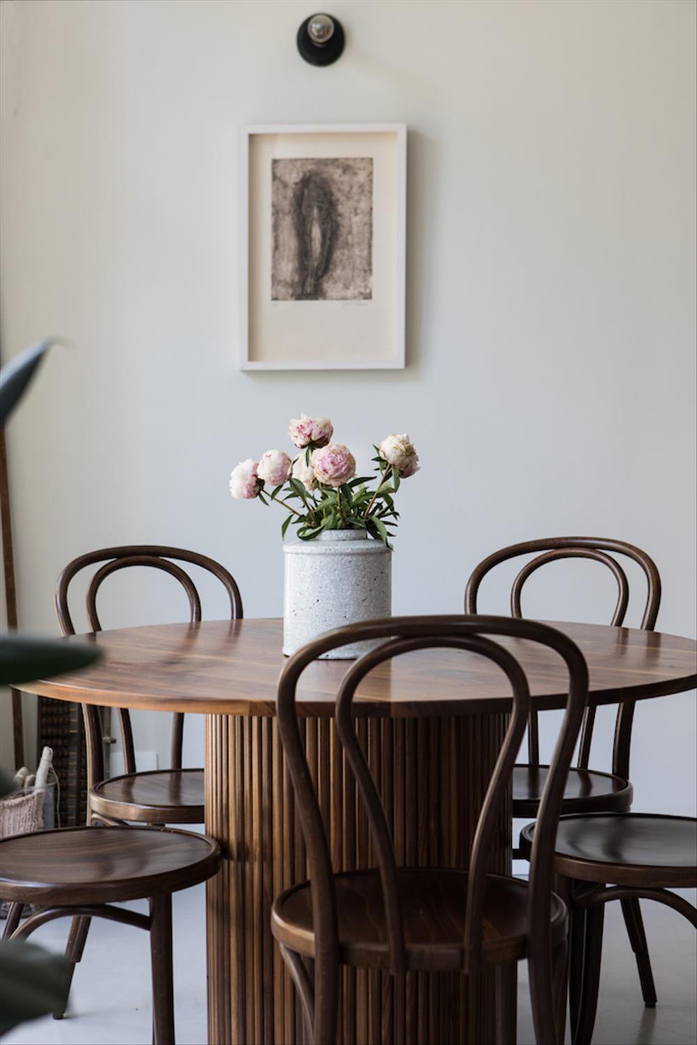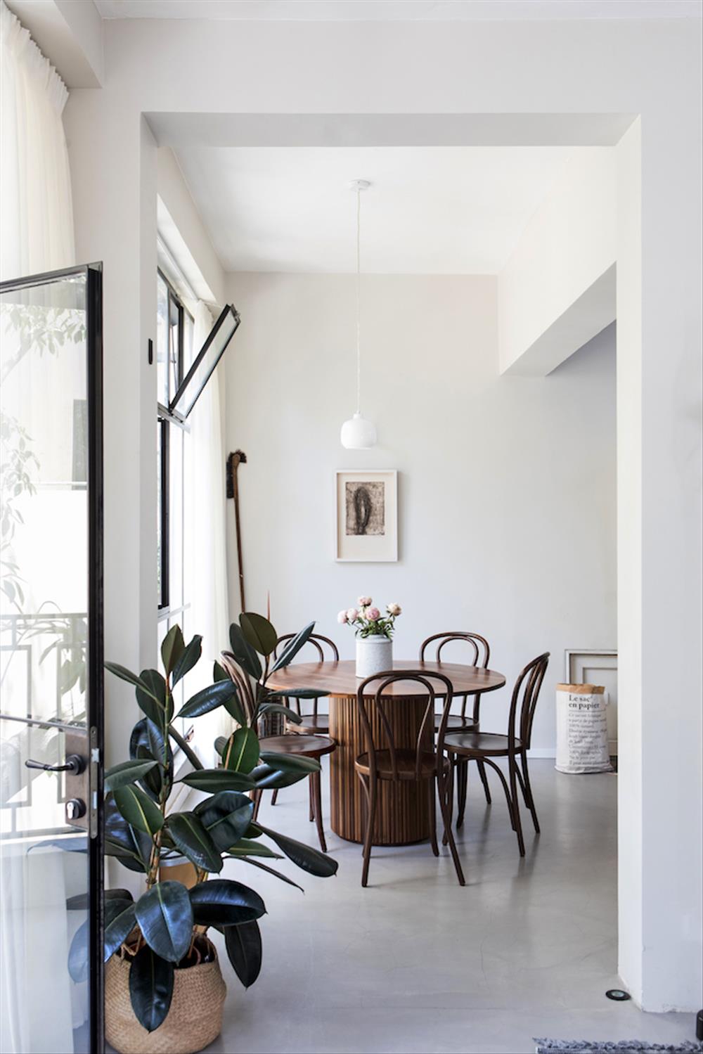 קורה רוחבית נמוכה, מקורות הדירה המקוריות, יוצרת מעין הפרדה בין המטבח לפינת האוכל, שניצבת במרווח נעים בהמשך לאי, מול אחת משתי הוויטרינות. שולחן האוכל העגול שונה בצורתו ובחומריותו מהמטבח שמאחוריו. הוא נבנה בידי נגר בהזמנה ועשוי מעץ טבעי מלא. הכסאות סביבו, בצורת tonet הקלאסי, בגוון עץ תואם, ומעל תלוי אהיל עדין מזכוכית לבנה שהזכיר לי את סבתר שלי ובכלל את הפשטות של הדירות הישנות בתא.