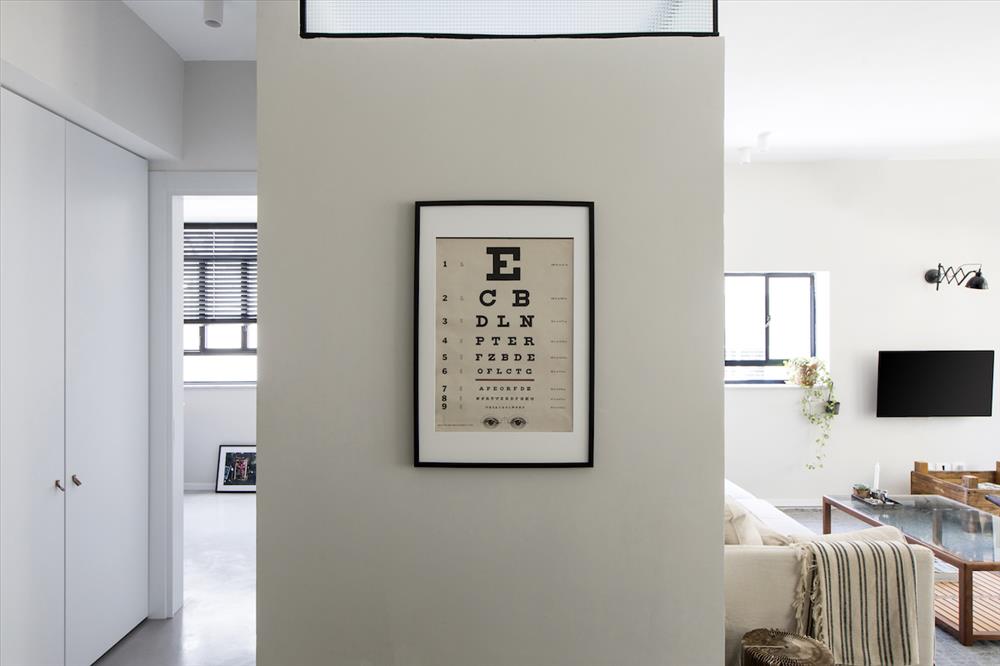 הסלון נשען בגבו על קיר חדר הרחצה המרכזי, שבחלקו העליון פס אור – חלון היקפי ממוסגר בפרופיל ברזל שחור, עם זכוכית מחוסמת. הפס מכניס לסלון ולמטבח אור מכיוון נוסף, ובלילה הקיר נראה כמו גוף תאורה תלת ממדי.