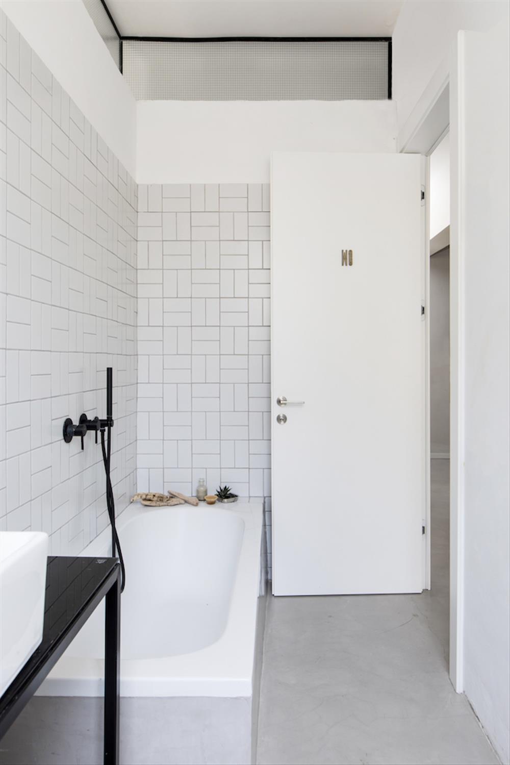 אל חדר השינה השני בדירה, המשמש כחדר האורחים, מוביל קיר נישה שבתוכו מוצג אוסף חפצים שאספתי במסעותיי. נישה נוספת בקיר משמשת כארון למכונת הכביסה. בחדר הרחצה הכללי, הצמוד לחדר האורחים, רצפת המיקרוטופינג מטפסת על חזית האמבט; הקירות חופו עד גובה הדלת באריחים לבנים פשוטים, אך צורת הנחתם יוצרת דוגמה גיאומטרית. כיור חרסינה ריבועי יושב על שולחן ברזל שחור, שהותאם למקום. שתי מנורות עתיקות מבית סבתא חודשו והותקנו לצד מראה לבנה של איקאה.