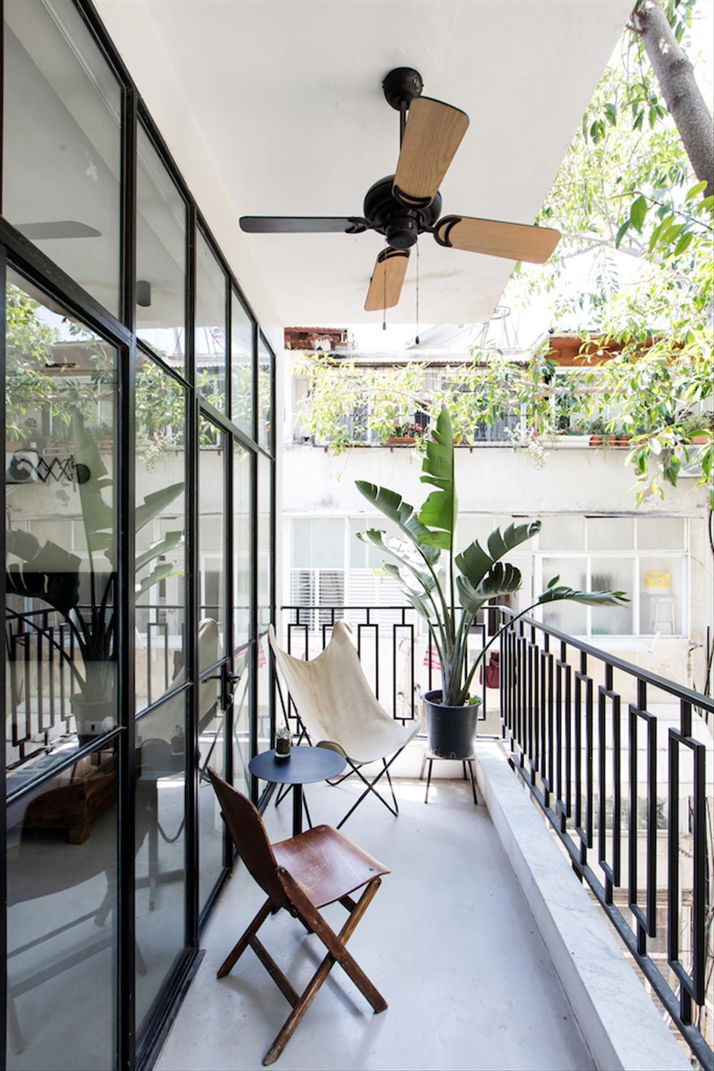 המרפסת הצרה שבהמשך לסלון בולטת מקו הבניין. היא מוקפת במעקה ברזל אוורירי ומרוהטת בפשטות, בהתאמה לקו הכללי, עם שולחן ברזל קטן, שני כיסאות וינטג' ומאוורר תקרה.