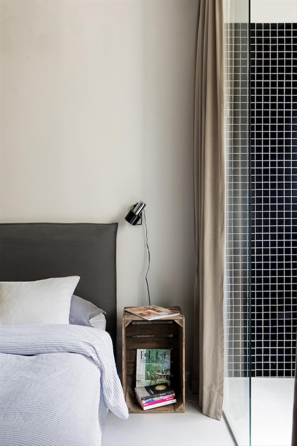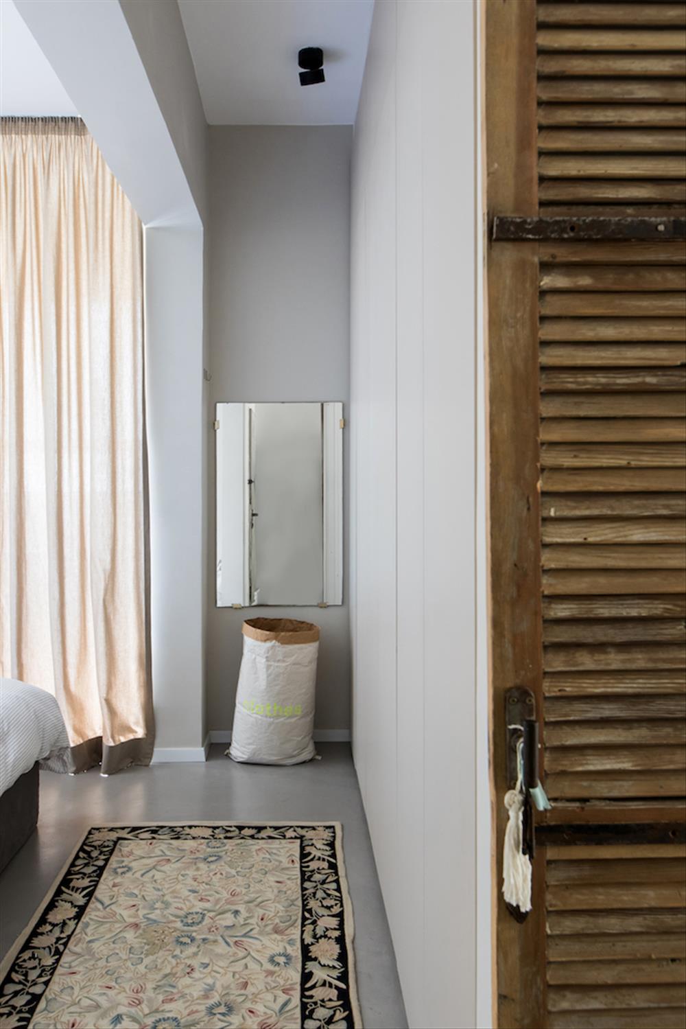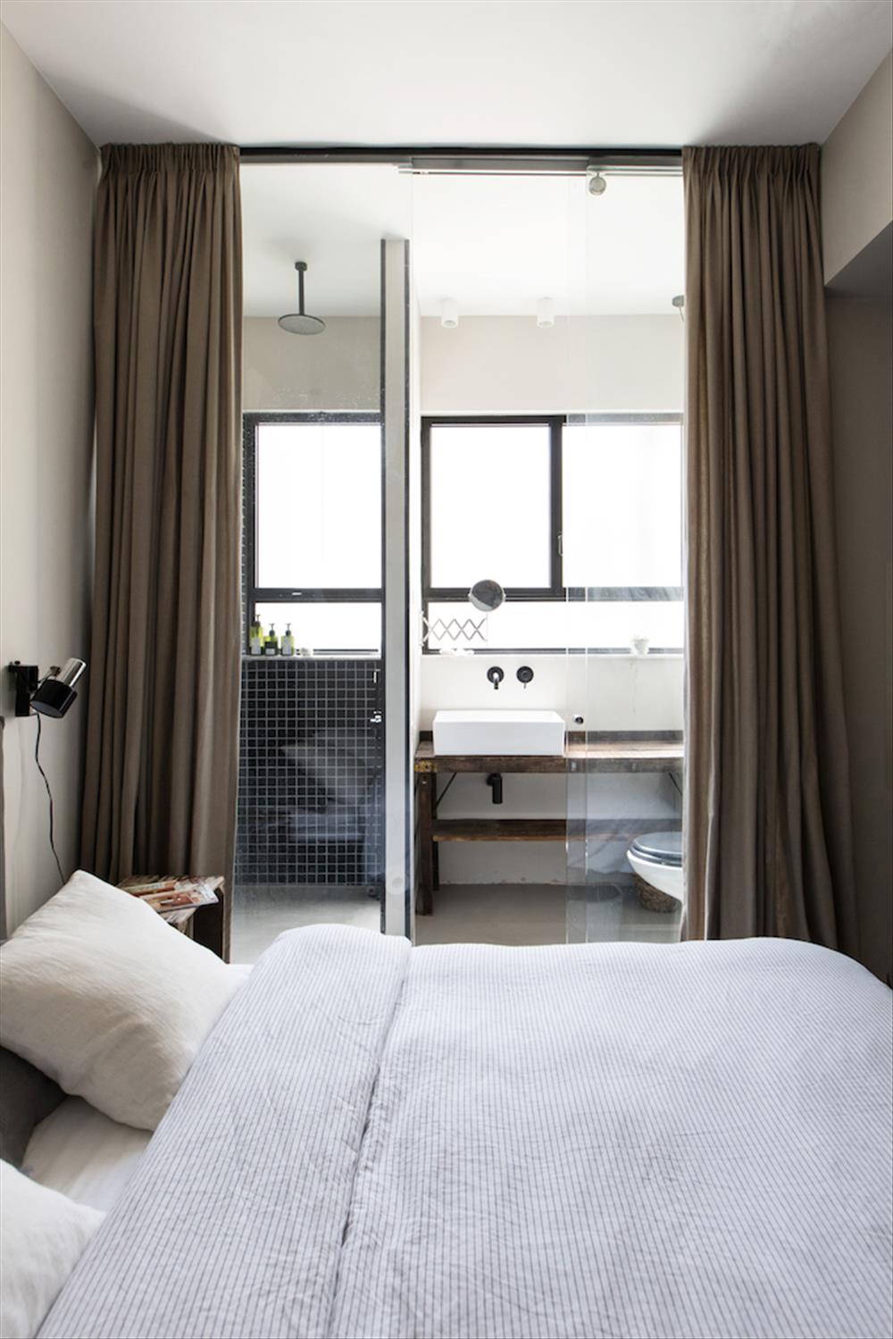 החדרים הפרטיים בדירה ממוקמים על חזית הצד של הבניין, ומעוצבים עם חומרי גמר בסיסיים ובסקאלה צבעונית של של לבן, אפור ושחור.חדר המאסטר נמצא משמאל לדלת הכניסה לדירה, ומובילה אליו דלת הזזה תלויה, שנבנתה מתריס עץ ישן – רציתי להימנע ממראה של דלת סטנדרטית ישר בכניסה לדירה. בתוך החדר מפריד קיר זכוכית בין אזור השינה לחדר רחצה צמוד.