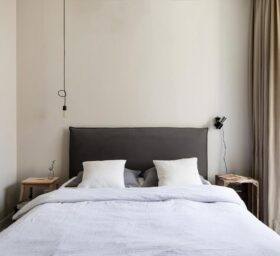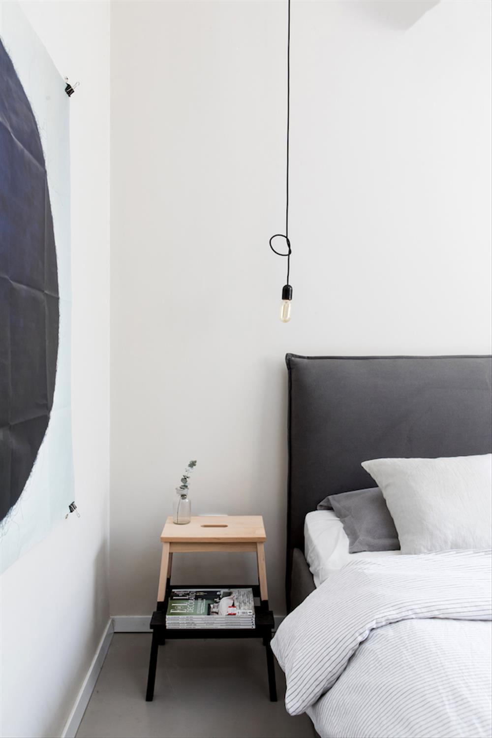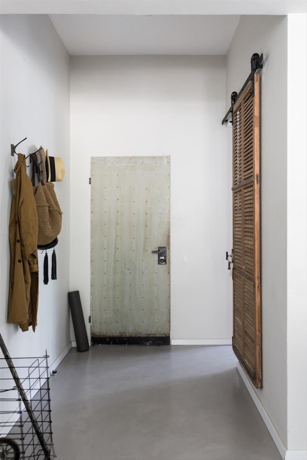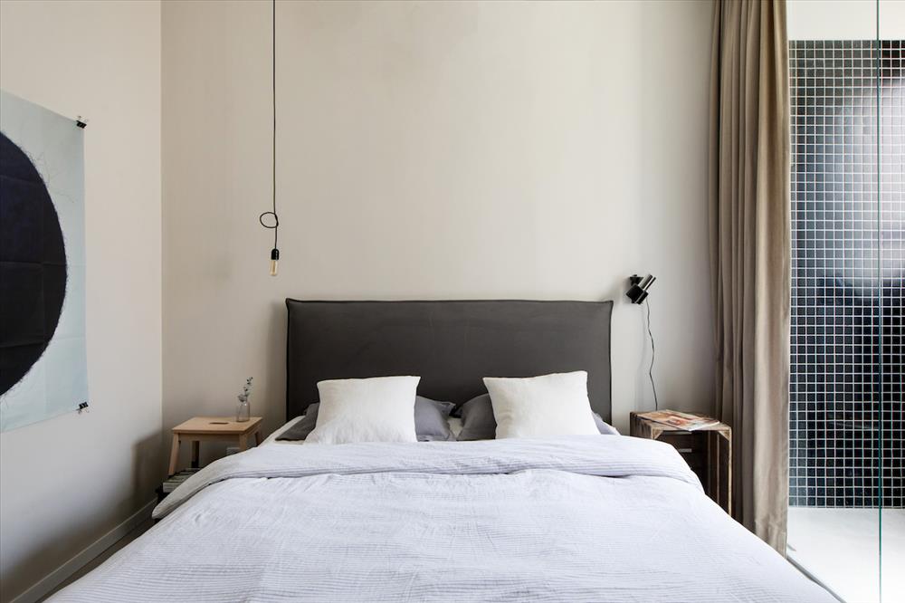 החדרים הפרטיים בדירה ממוקמים על חזית הצד של הבניין, ומעוצבים עם חומרי גמר בסיסיים ובסקאלה צבעונית של של לבן, אפור ושחור.חדר המאסטר נמצא משמאל לדלת הכניסה לדירה, ומובילה אליו דלת הזזה תלויה, שנבנתה מתריס עץ ישן – רציתי להימנע ממראה של דלת סטנדרטית ישר בכניסה לדירה. בתוך החדר מפריד קיר זכוכית בין אזור השינה לחדר רחצה צמוד.