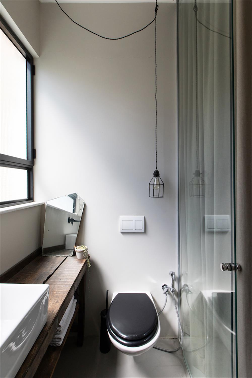 חדר הרחצה מאורך, מינימלי בגודלו, והחלון היחיד, והגדול, נמצא בשטחו, כך שקיר הזכוכית המפריד מאפשר מעבר של אור לאזור השינה. וילון לאורכו מאפשר הפרדה והחשכה. הקירות בחדר הרחצה צבועים ככל הדירה. המקלחת חופתה באריחי פסיפס שחורים, ושולחן עבודה מעץ מאסיבי, שנרכש בשוק הפשפשים, הותאם בידי נגר לשמש כשולחן כיור צר. גם כאן גופי תאורה מגוונים: שניים שונים זה מזה תלויים מעל שידות הלילה לצד המיטה, וגוף עדין מברזל תלוי לצד האסלה.