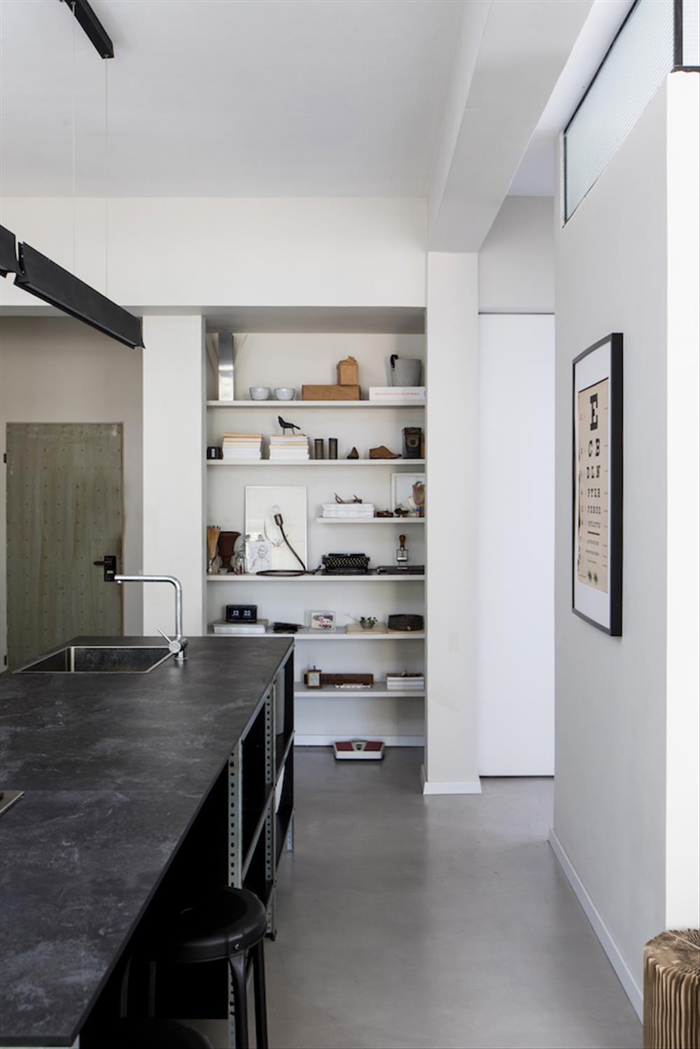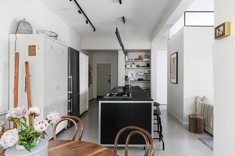 משני צדי המקרר עומדים ארונות לוקרים לבנים ופשוטים – גם הם מפח. זהו מוצר מדף תעשייתי שניתן להזמין בהתאמה אישית, ובמחיר נגיש. יחד עם המקרר השחור נוצר רקע נייטרלי, התואם חומרית לאי הפח המרכזי.