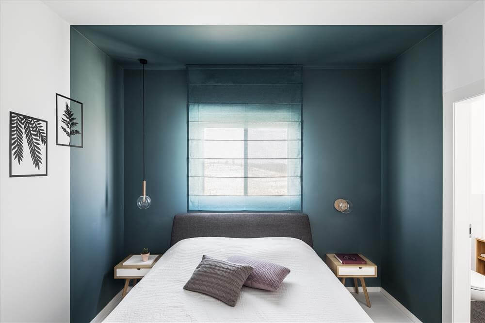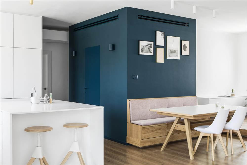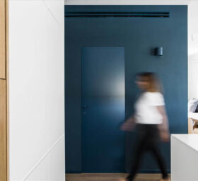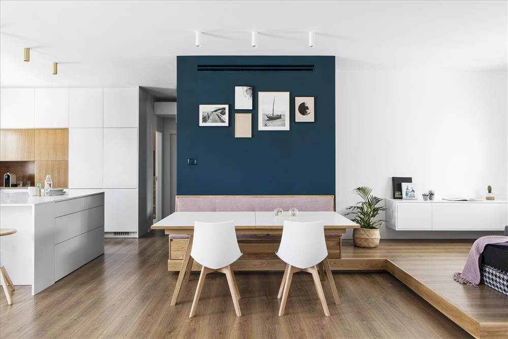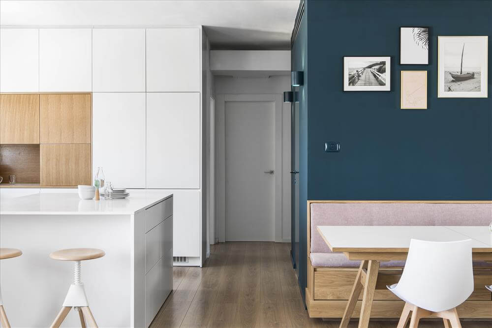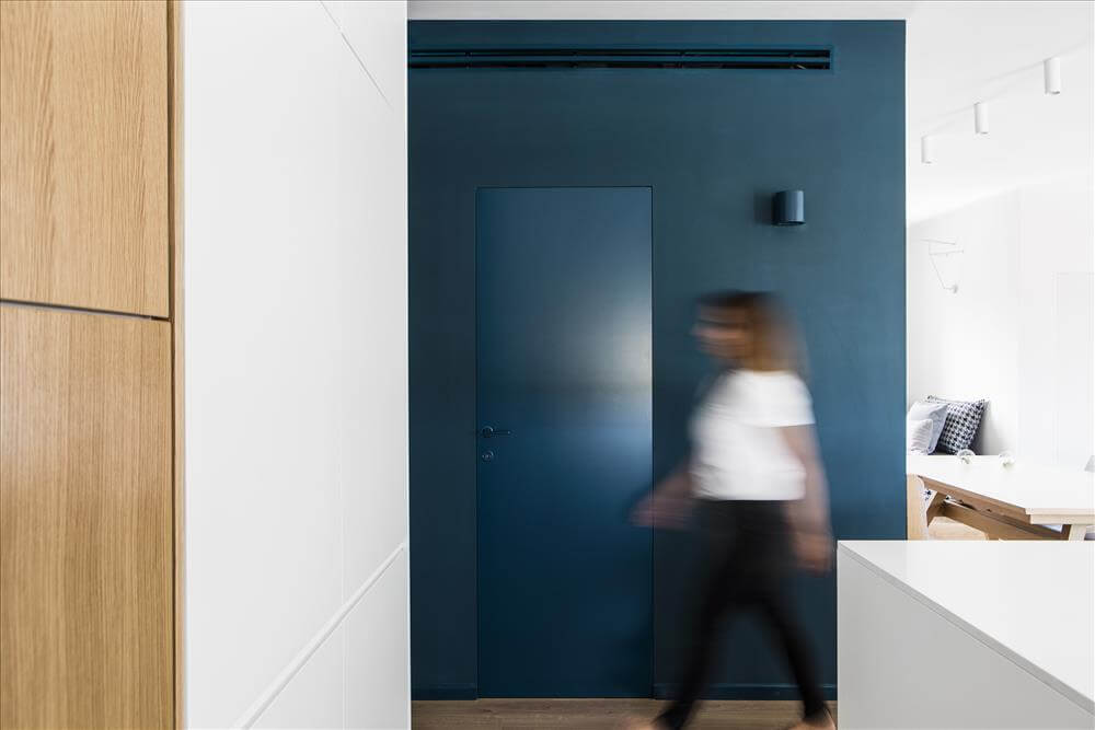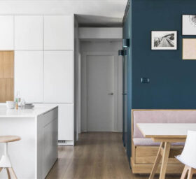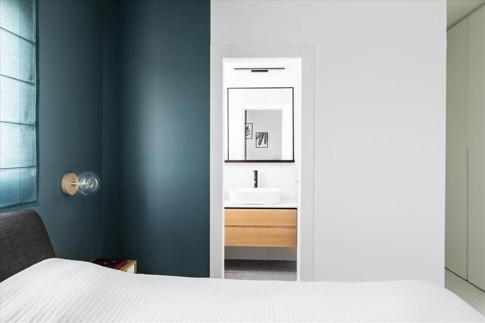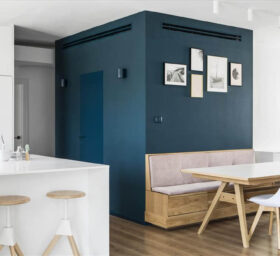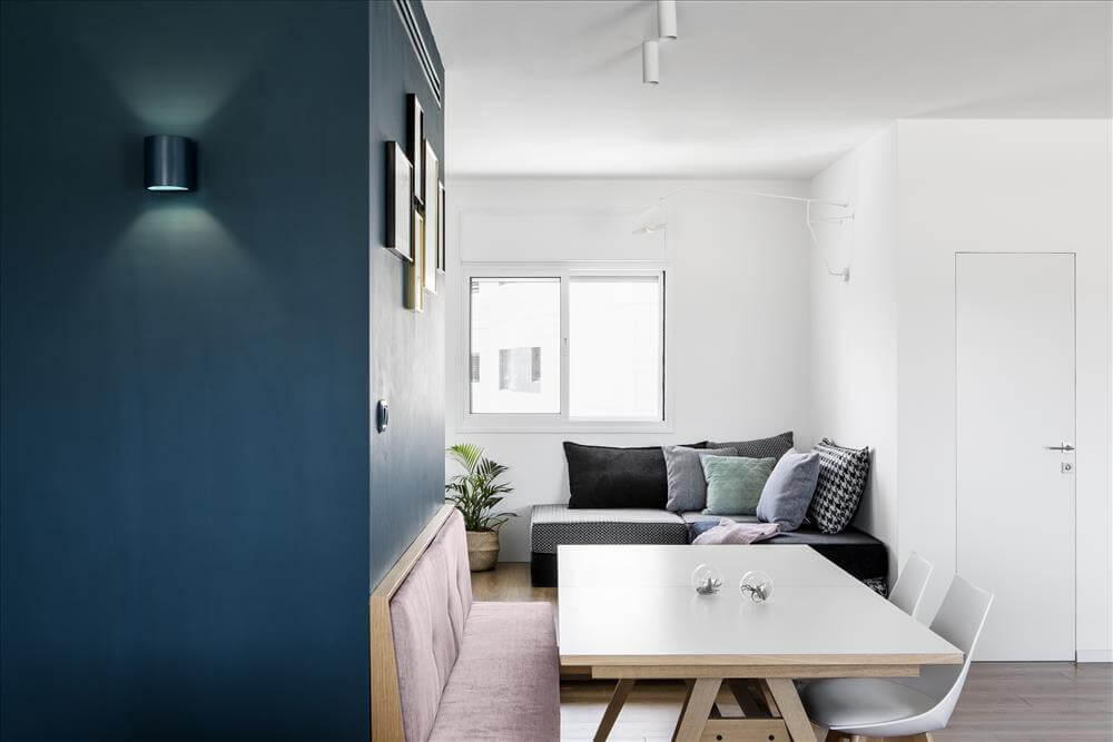 עיצוב דירה זו מאופיין בהגדרת אזורים ע"י שימוש בבלוקים של צבע ורצפה (מפלסים) כאשר את פינת המשפחה הגדלתי, תיחמתי והגדרתי באמצעות במה הממשיכה כספסל בעל 3 מגרות אחסון בפינת האוכל ואת "הקוביה" במרכז הבית, באמצעות צבע דומיננטי ירוק כחלחל המסמל צמיחה והתחדשות בדיוק כמו התהליך בו נמצאים הדיירים. כל קירות הבית (למעט קירות הקוביה) נצבעו בלבן וכך גם הקפדתי לעשות עם משקופיי החלונות והתריסים בחלל המגורים (שבמקור היו בגוון משי חום) זאת, על מנת להעצים את מרכז הבית הירקרק.