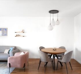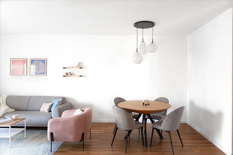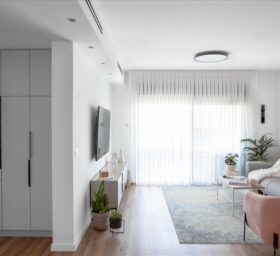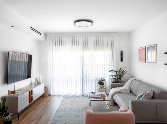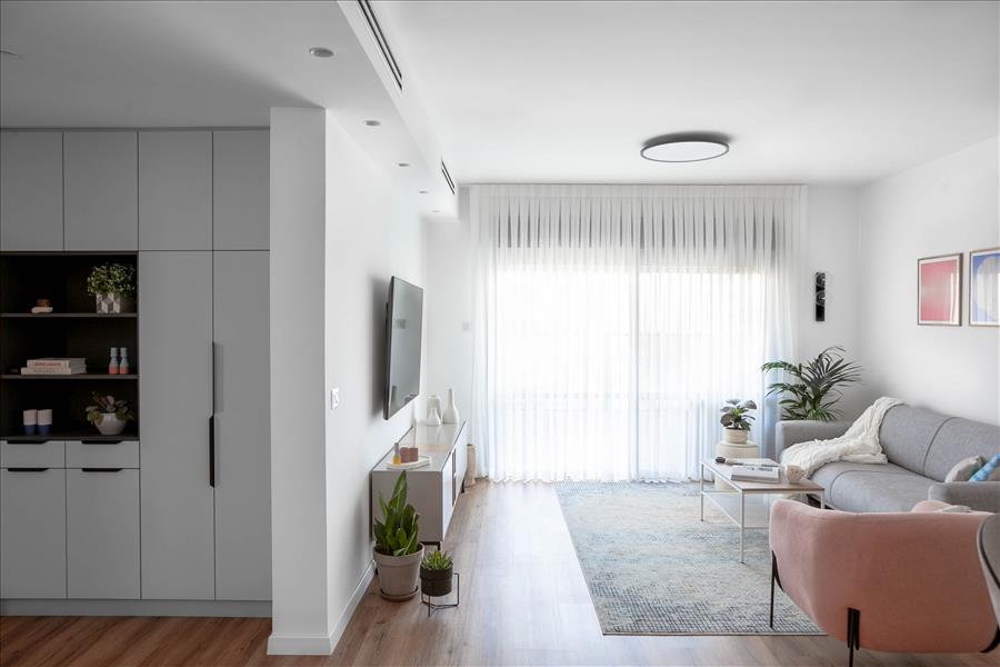 השיפוץ כלל את כל הדירה, אך התרכז בעיקר בחלל המרכזי והמטבח. הדרישה היתה ליצור חלל בסגנון נורדי, בקווים נקיים ובגוונים רגועים. נבחרה פלטת צבעים עדינה מאוד עם נגיעות של צבע נקודתיות בריהוט ובטקסטיל. עיצוב מסוג זה הוא אמירה אמביוולנטית, לא חד משמעית, שמתאימה את עצמה לכל תחושה וכל מצב רוח, לא מחייבת ואל-זמנית. קנבס מונוכרומטי, שעליו ניתן היה להוסיף כל דגש, כל תחושה, כל צבע.