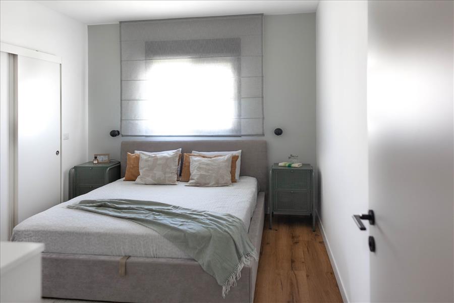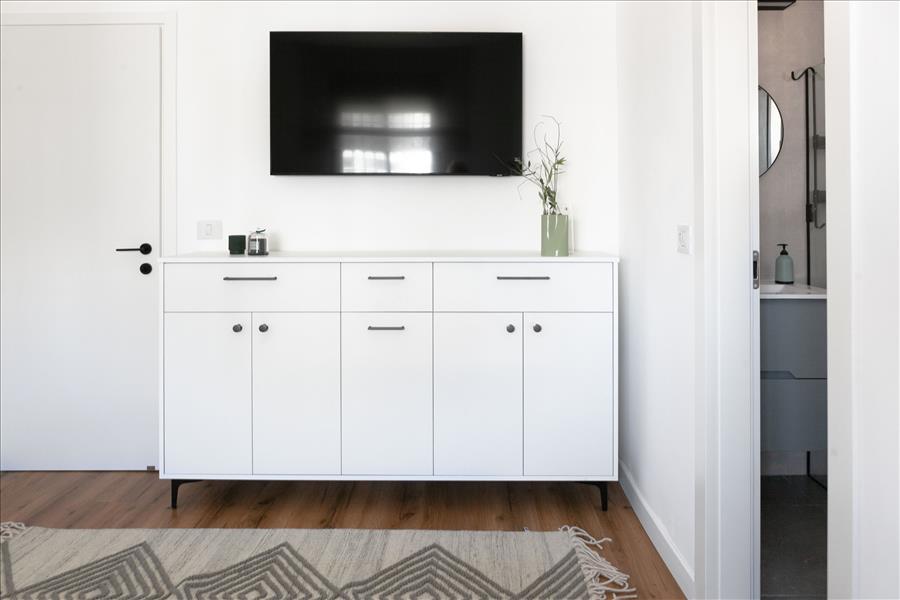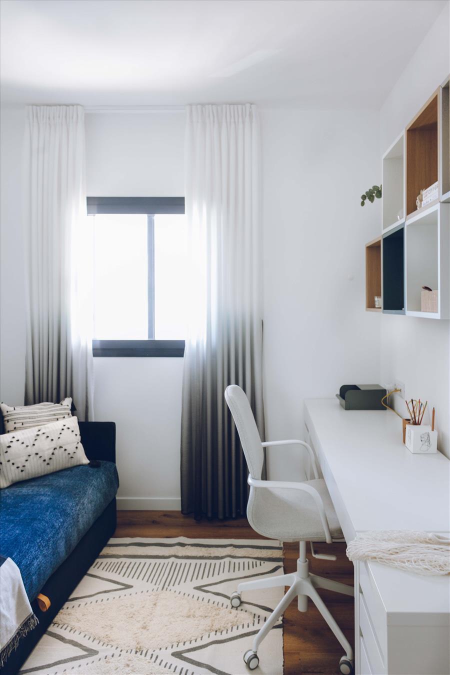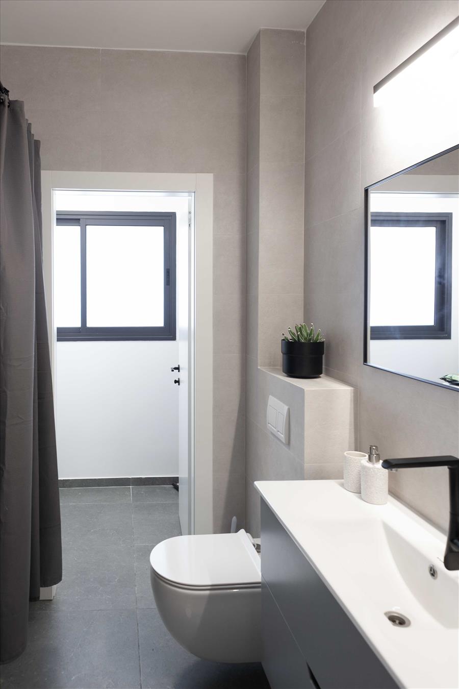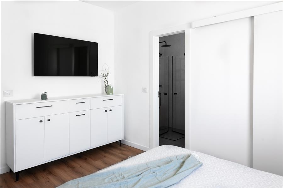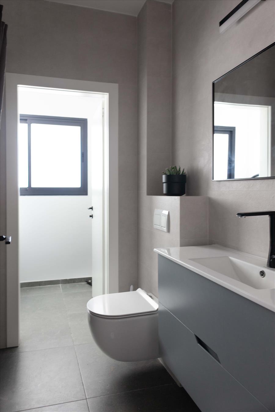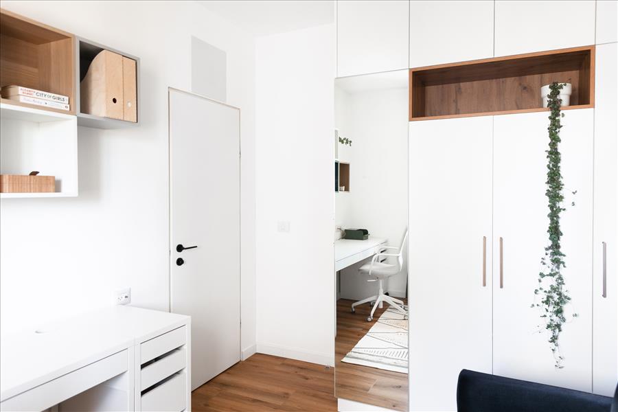שני חדרי הרחצה בדירה שופצו מן היסוד גם הם. בחדרי השינה תכננו יחידות אחסון לפי הצרכים של הלקוחות – שידה לבנה ואוורירית להורים וארון בגדים עם חזית כפולה ומראה למתבגרת.