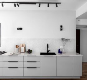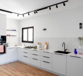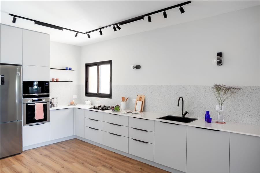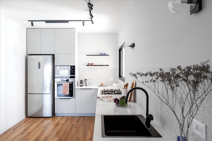 הלקוחות ביקשו מטבח לקוני ללא אי ישיבה ורצפת פרקט בכל חללי הדירה (עמיד למים). פינת האוכל פינתה את מקומה לארון מעילים המשלב ספריה, והקיר המפריד בין פינת האוכל המקורית לבין הסלון צומצם, על מנת לאפשר חלל מרווח ומואר יותר. הטעם המשובח של הלקוחות הנחה אותנו בבחירת הריהוט והתאורה. הקיר במטבח חופה באריח טרצו שהושקע בתוך הקיר על מנת ליצור מראה חלק, ללא מדרגה או בליטה כלל.