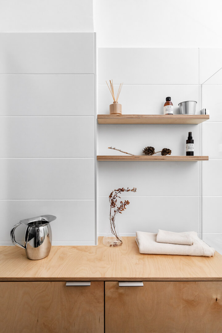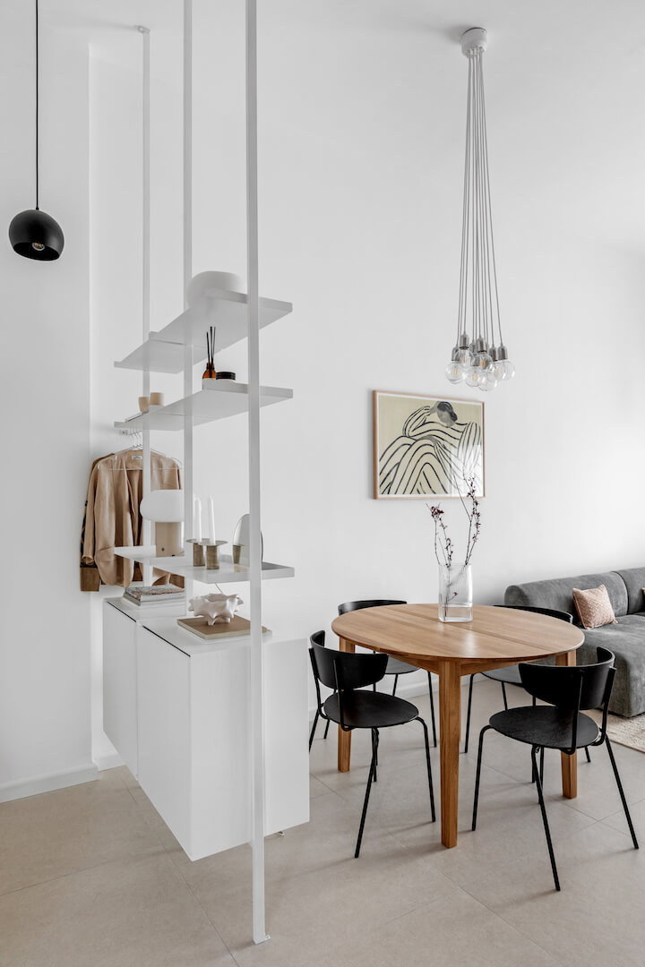 בכניסה לבית, בחרתי לשלב ספרייה ובאמצעותה לייצר מבואת כניסה. הספרייה תוכננה ועוצבה במיוחד לפרויקט, באופן כזה שאינו חוסם או מצמצם את החלל.