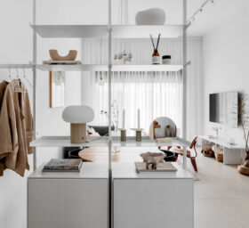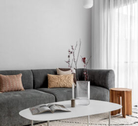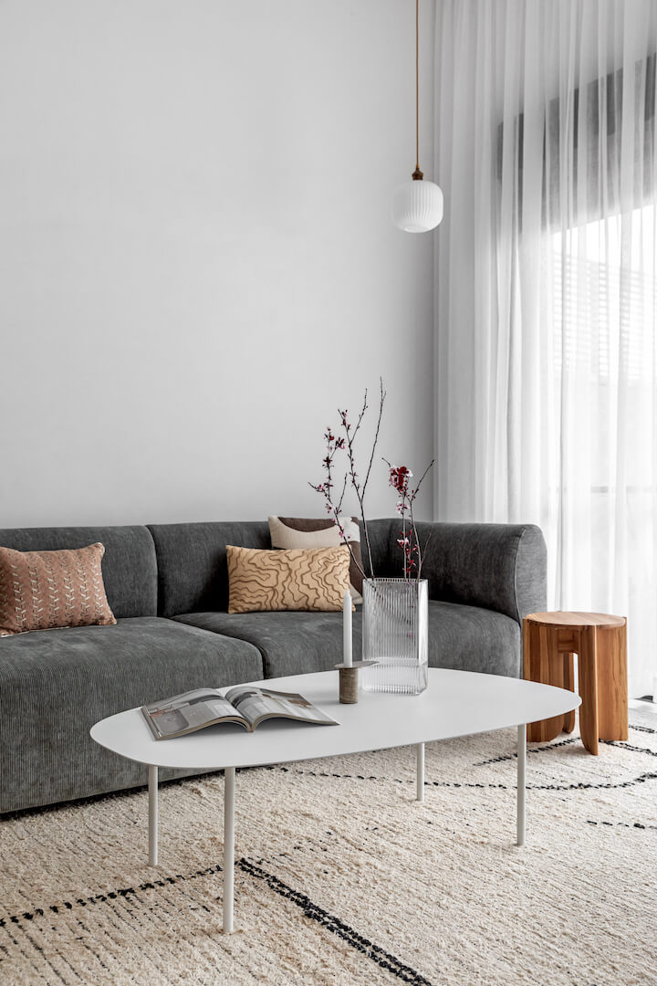 את הסלון מיקמנו באופן מקביל, כלומר, ספה ומולה 2 כורסאות. זאת על מנת לייצר סלון מזמין ואינטימי וכן על מנת להגדיר את החלל.