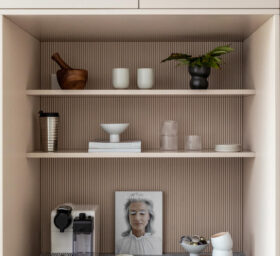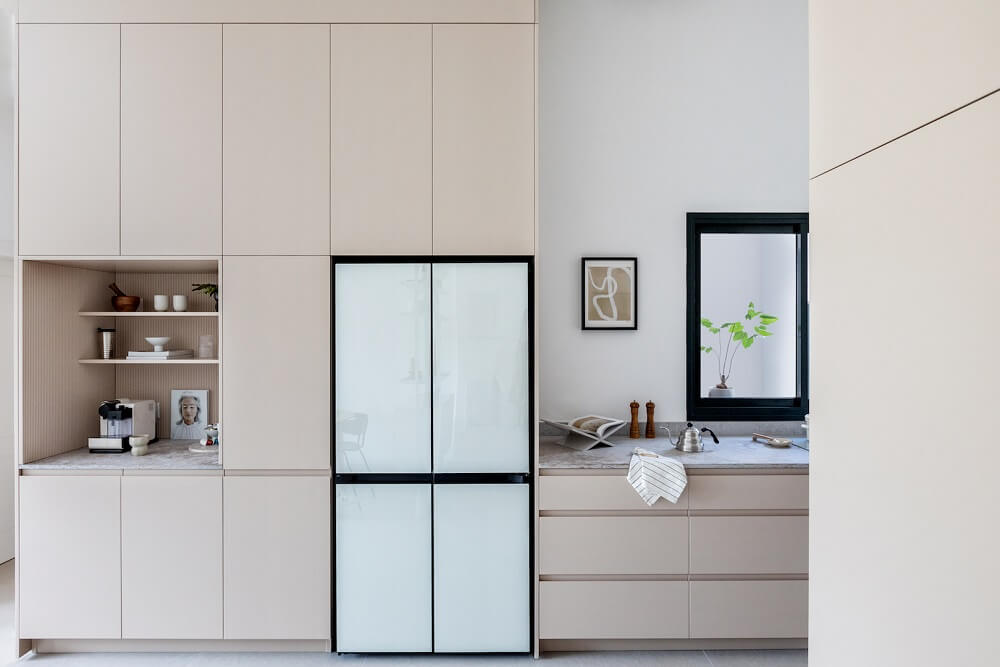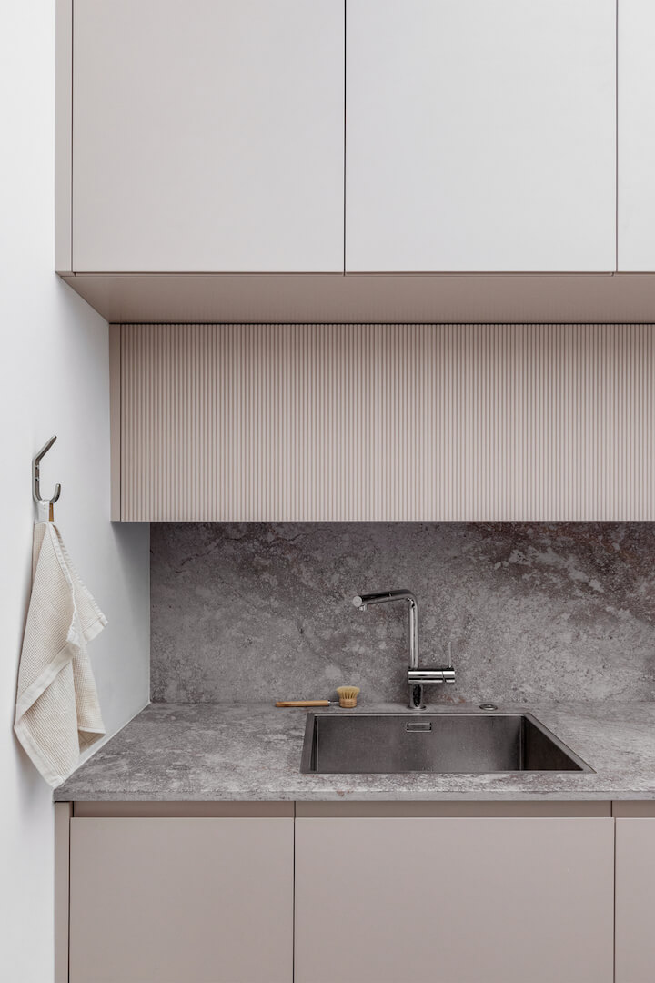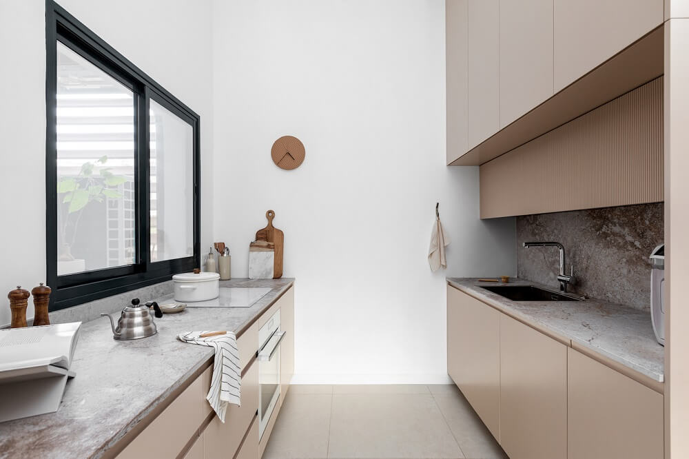 המטבח תוכנן ע"י הקבלן להיות בצורת ר'. על מנת ליצור מראה צעיר יותר, החלטנו ליצור שני סטריפים מקבילים רחבי ידיים. באחד הוצב הכיור, כשמעליו קלאפה בטקסטורת פסים, וממול הוצבו כיריים, משטח עבודה, פינת קפה וארונות גבוהים הממשיכים עד לקצה המסדרון, לצד פינת האוכל.