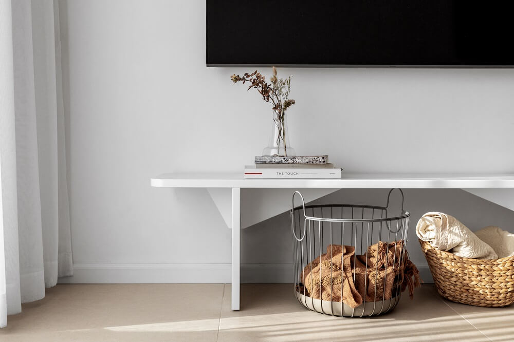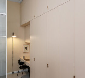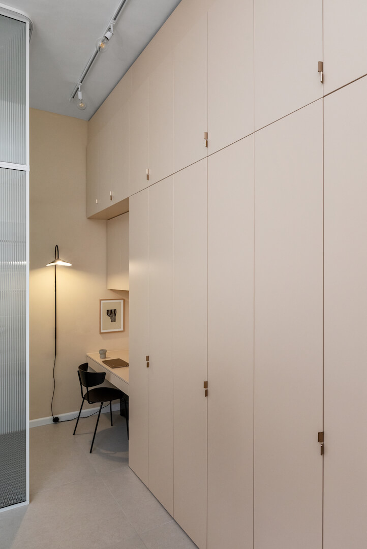 תוכנן ארון נגרות לאורך כל הקיר, כאשר בסופו מיקמנו פינת עבודה לבקשת הדיירים אשר אחד מהם עובד הרבה מהבית.