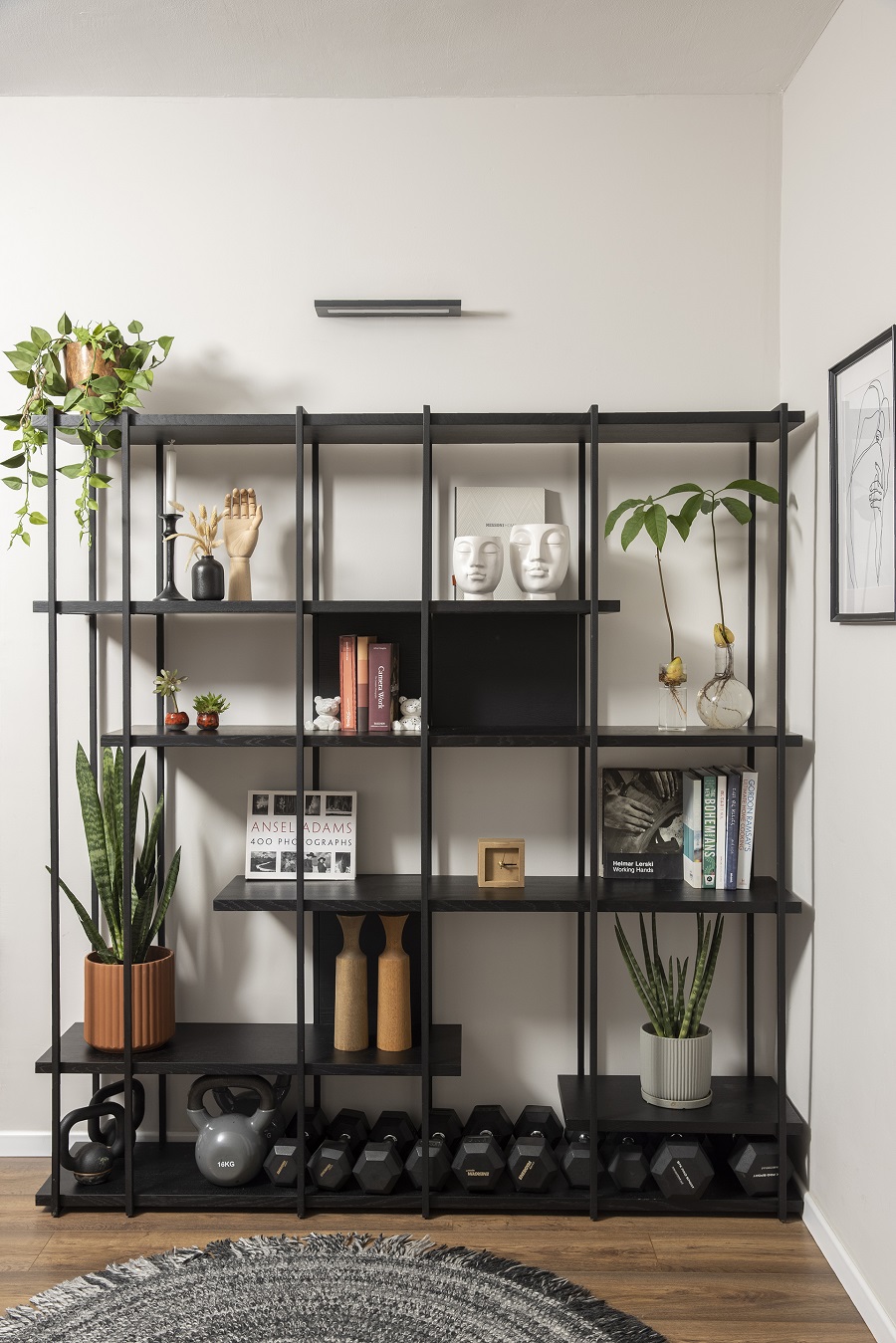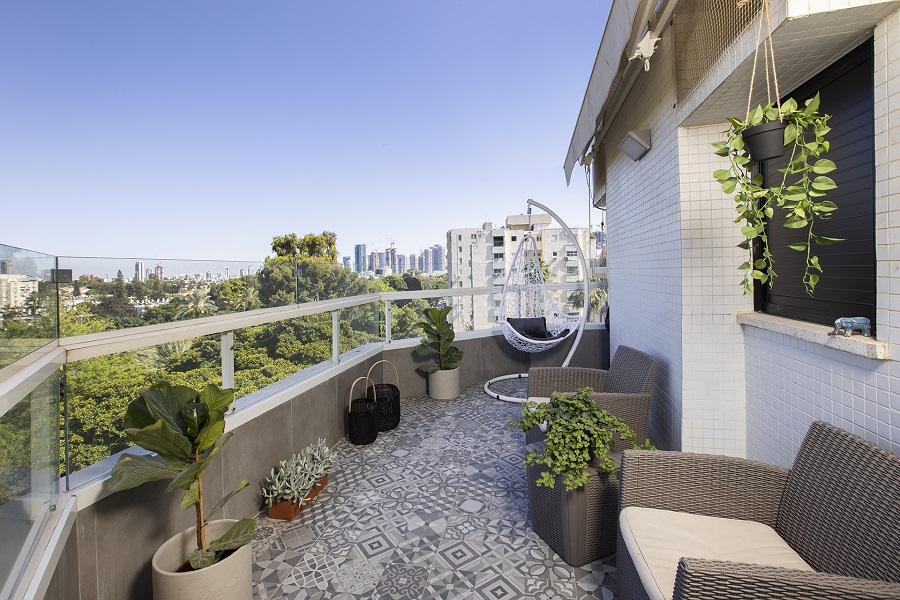 לאחסון מזרני ו האימון והגומיות נמצא פתרון בארון האחסון בכניסה עם ספסל ישיבה ואת המשקולות הרבות שצריכות להיות זמינות וקרובות, איחסנו במדף התחתון בספריית הברזל בסלון. המרפסת רוצפה מחדש והמעקה בה הוחלף גם הוא.