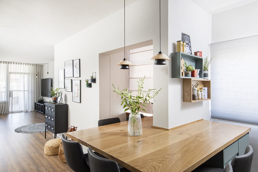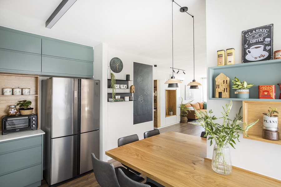 במטבח לבין האי כך שאיזור העבודה אמנם מופרד אך היא נשארת במרכז העניינים ונשארת האופציה גם לאכול על האי ולארח בו זמנית.