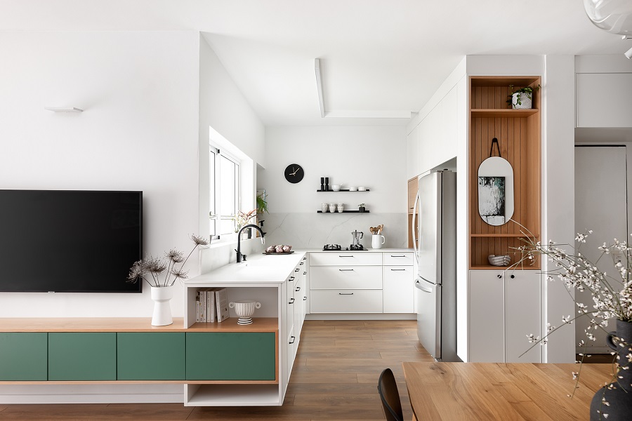 מטבח, סלון, פינת אוכל ולמצוא פתרונות לאחסון שהיה מאד חסר בבית.