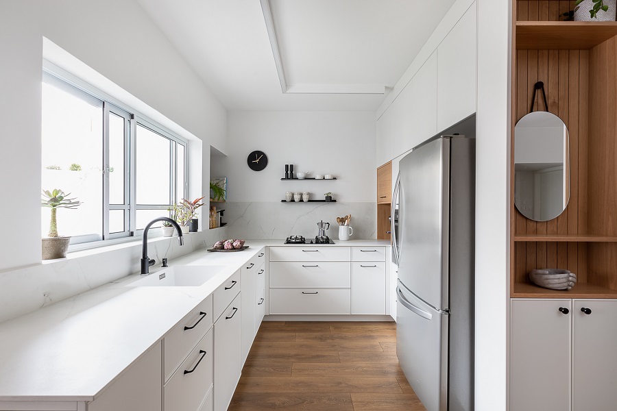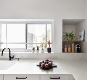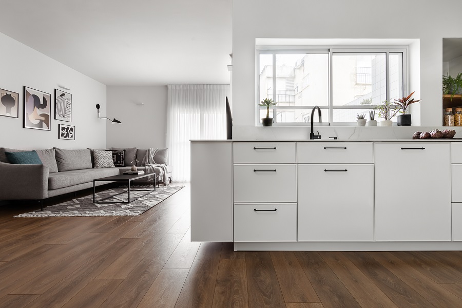 צידו השני של המטבח ממשיך אל עבר הסלון עם מזנון תלוי שממש מחוברלנגרות המטבח.