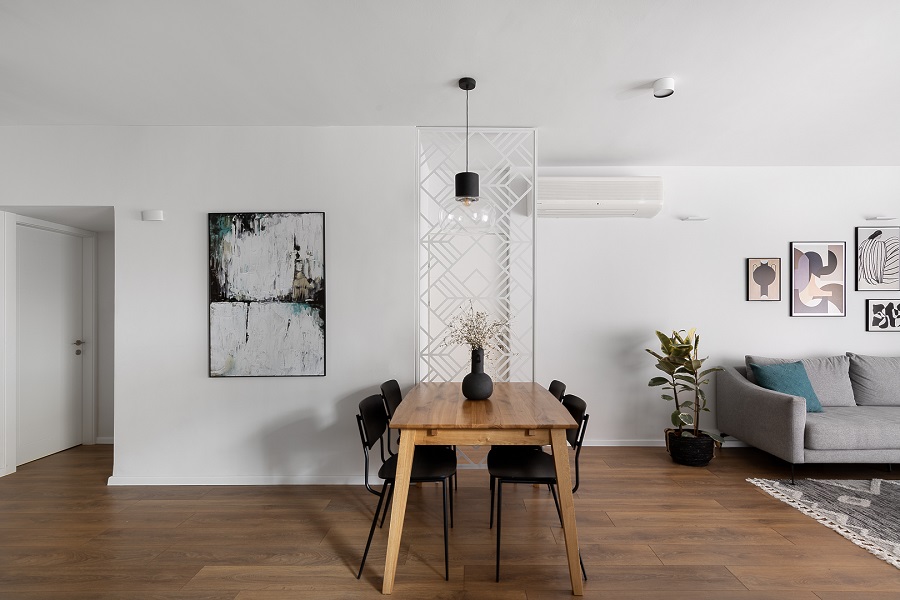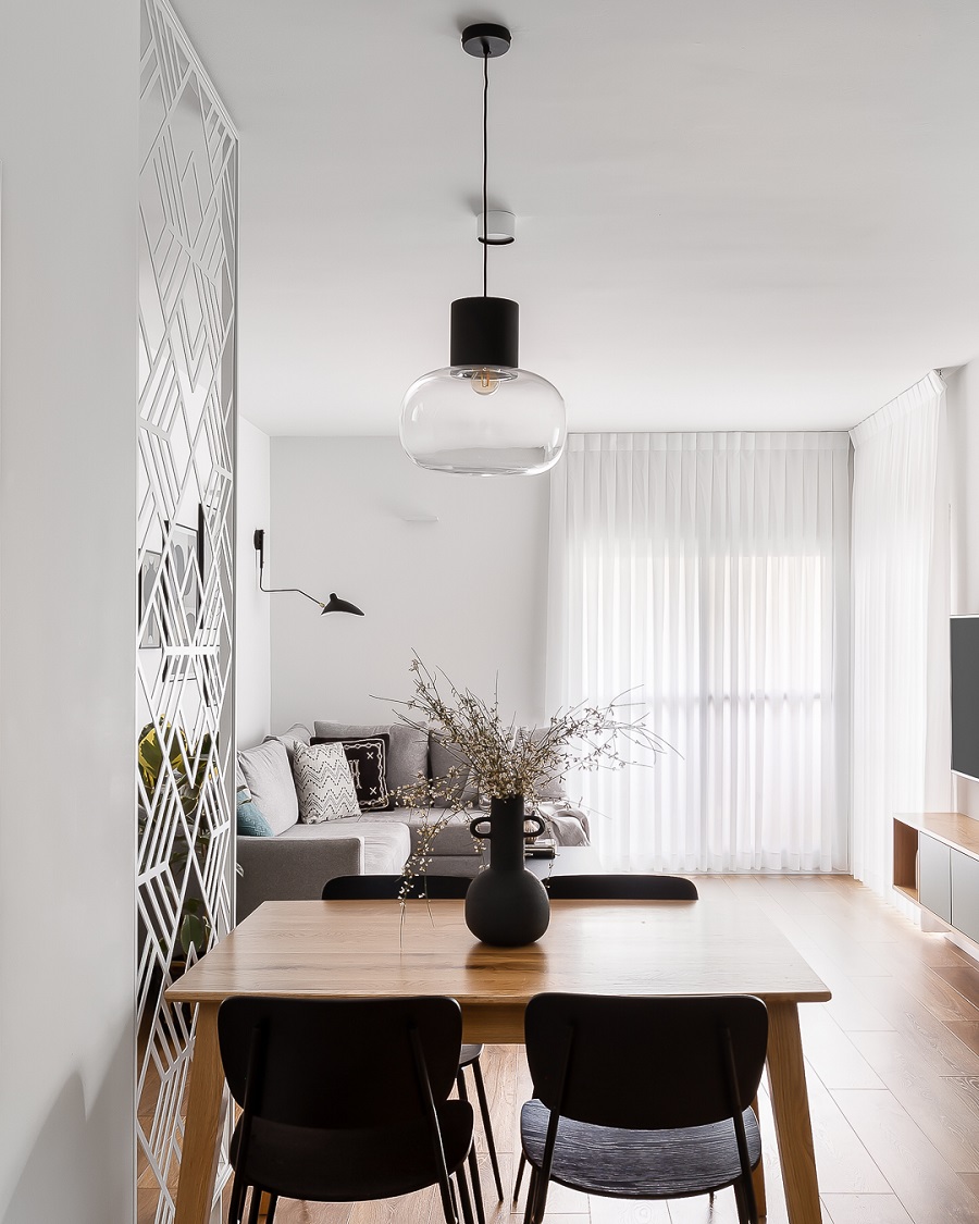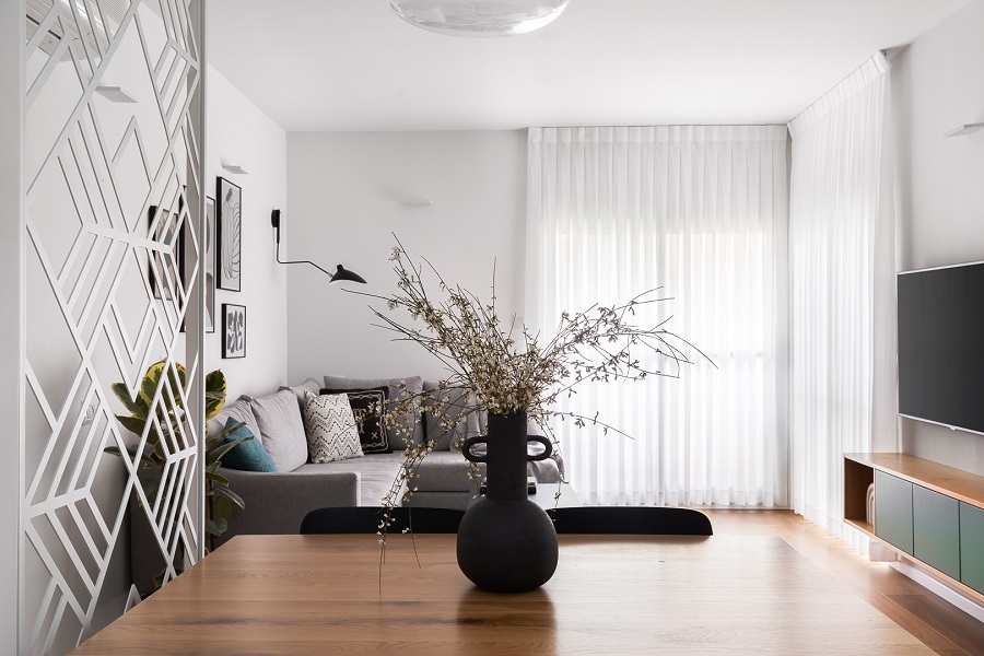 את דלת חדר השינה (היוצאת ממש מתוך הסלון,) הסתרתי עם מחיצת משרבייה יפה וביצדה השני יושב שולחן האוכל.