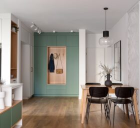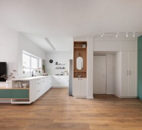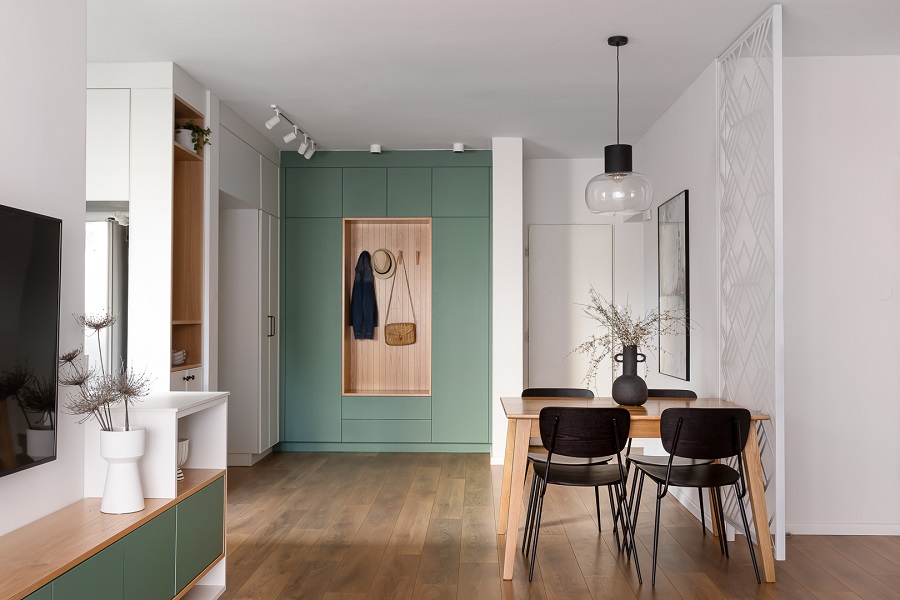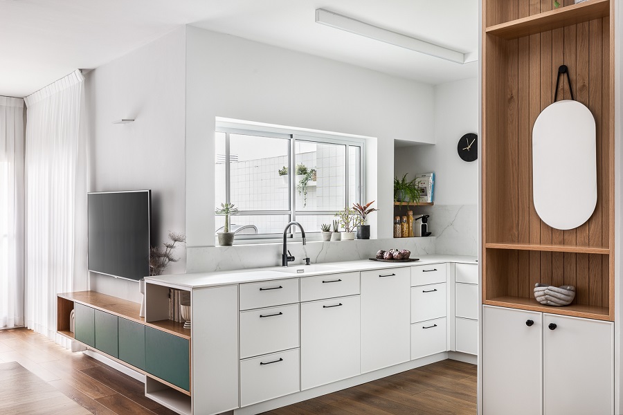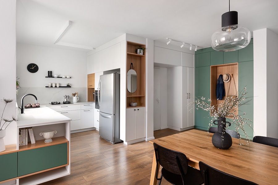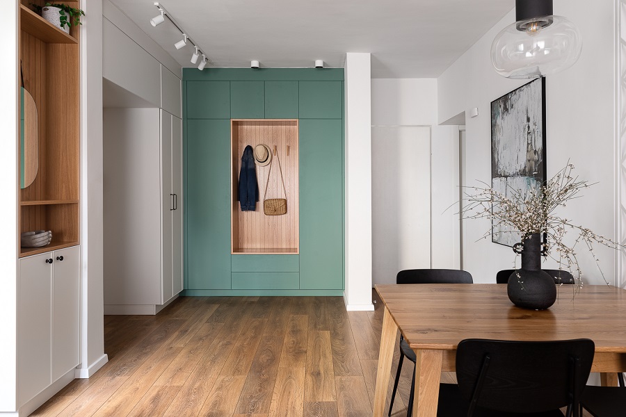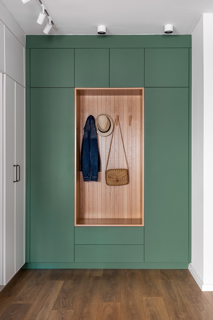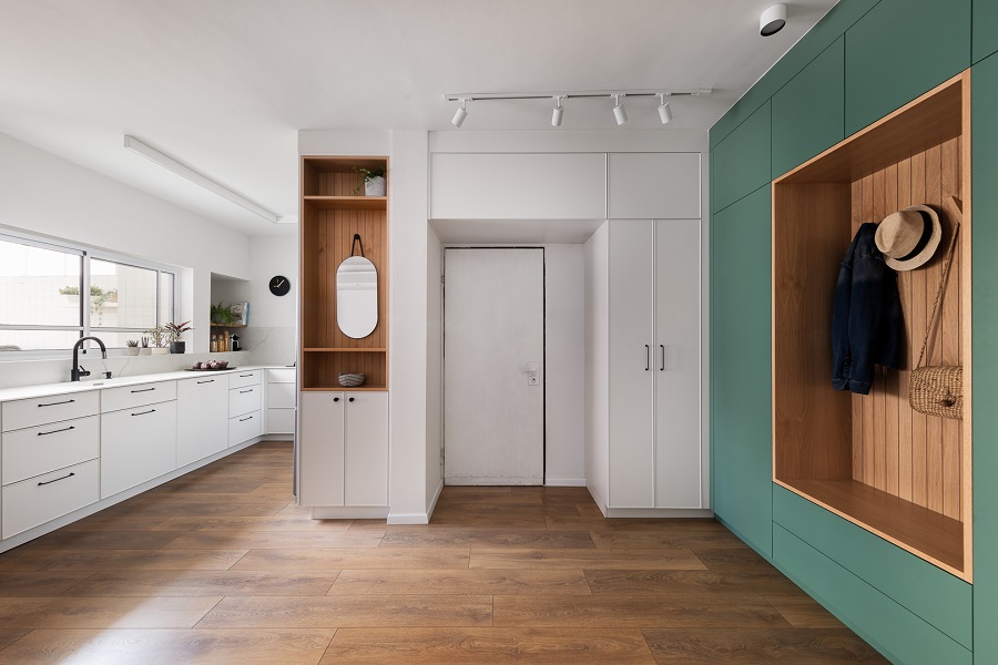 לחלל כולו בחרנו בגוונים בהירים ורגועים עם כתמי צבע ירוק בארון הכניסה ובמזנון.