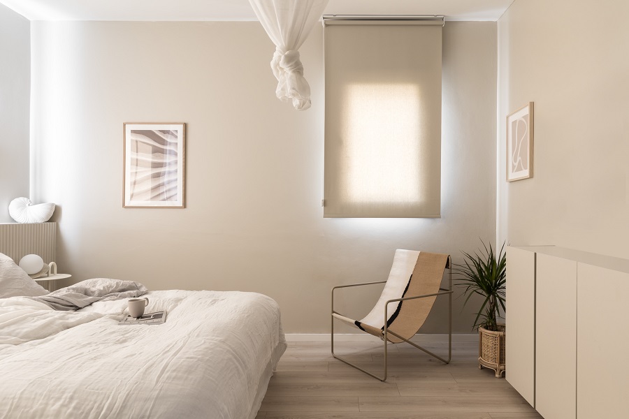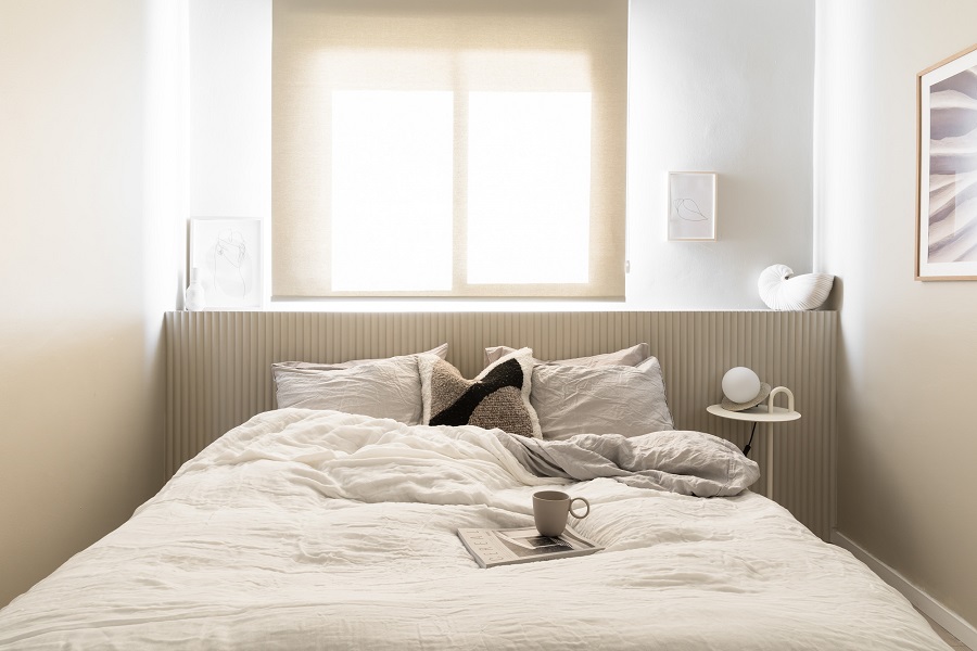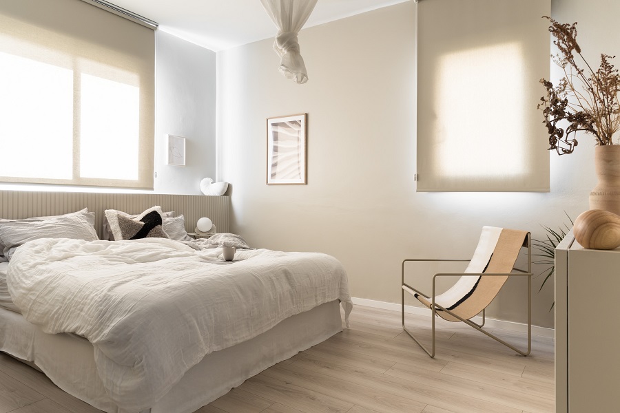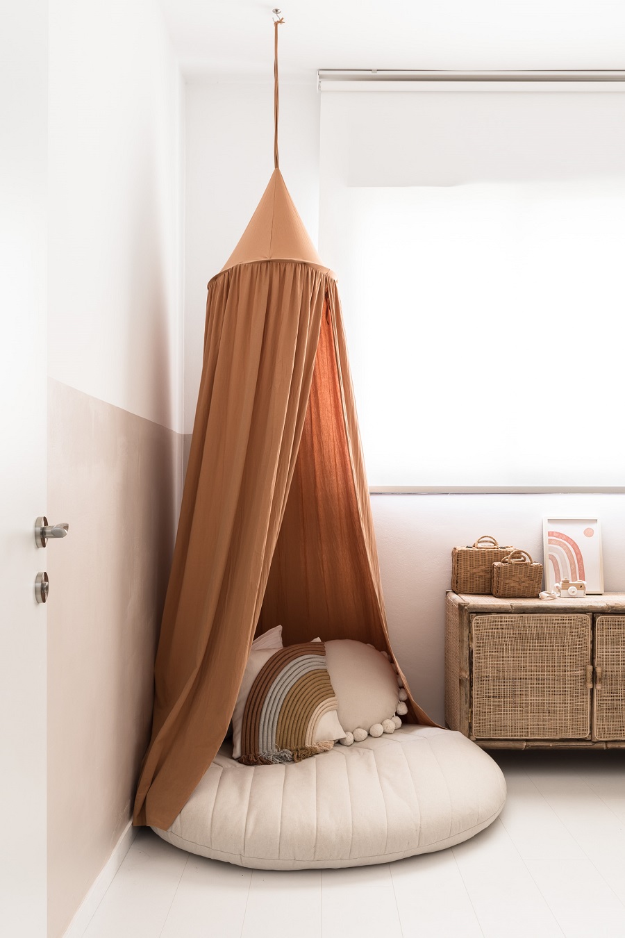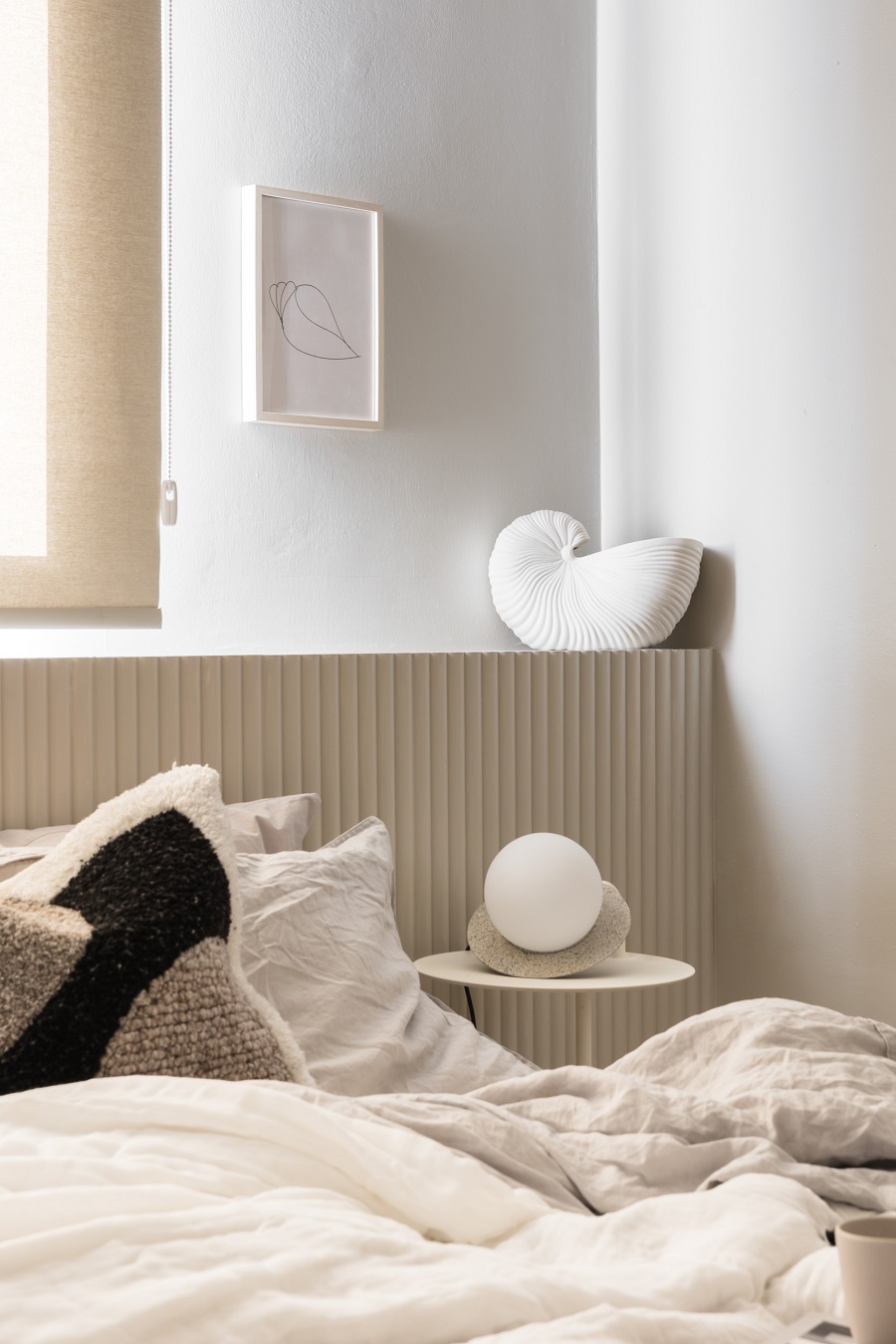 את החדר הורים עטפתי בצבע אחד למראה עוטף אחיד ובהיר יחד עם זאת חמים ונעים -מכיוון שהמיטה הישנה נשארה הוספתי חצאית פשתן למיטה. הראש מיטה בעצם היה הקיר שלנו שיצרתי מדרגה מגבס עם חיפוי גלים למראה של חול