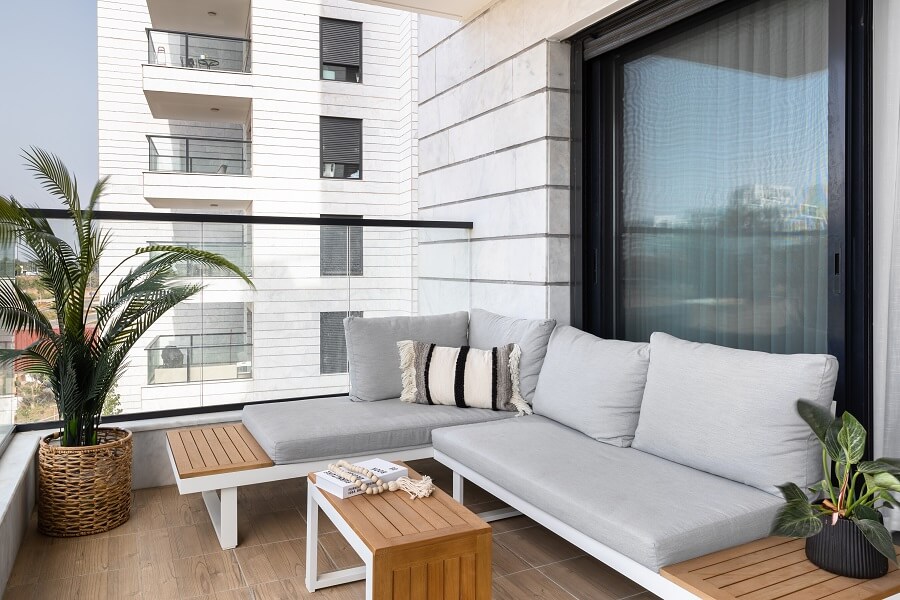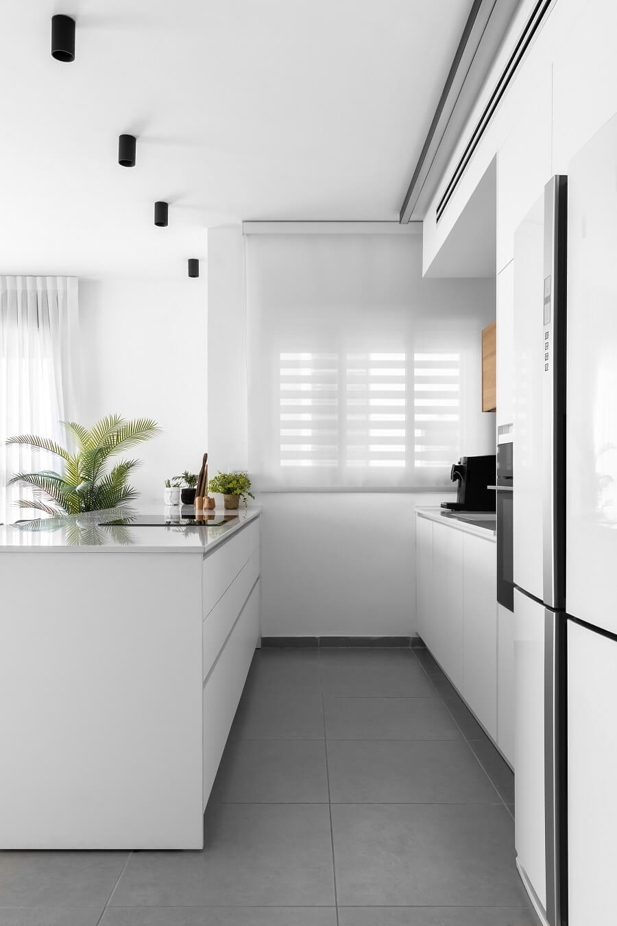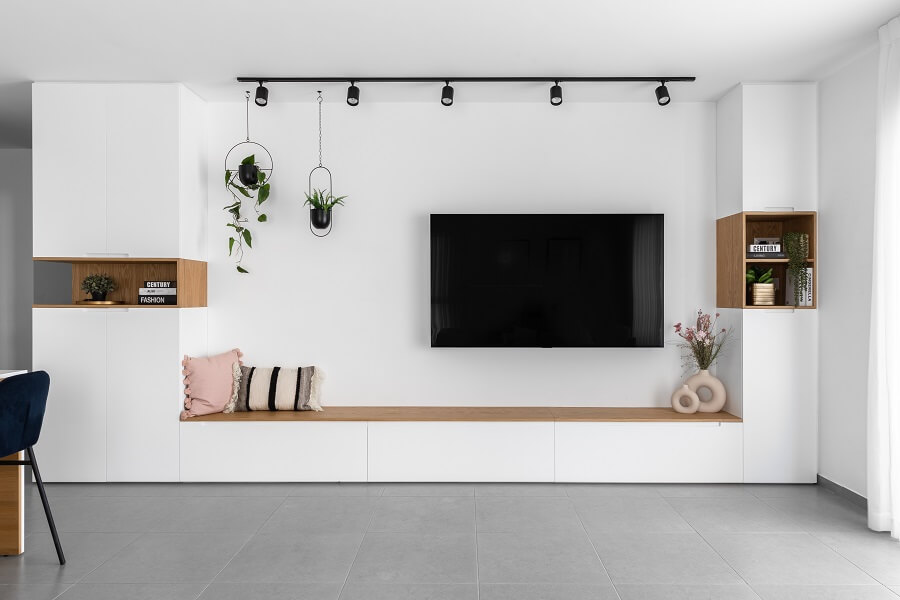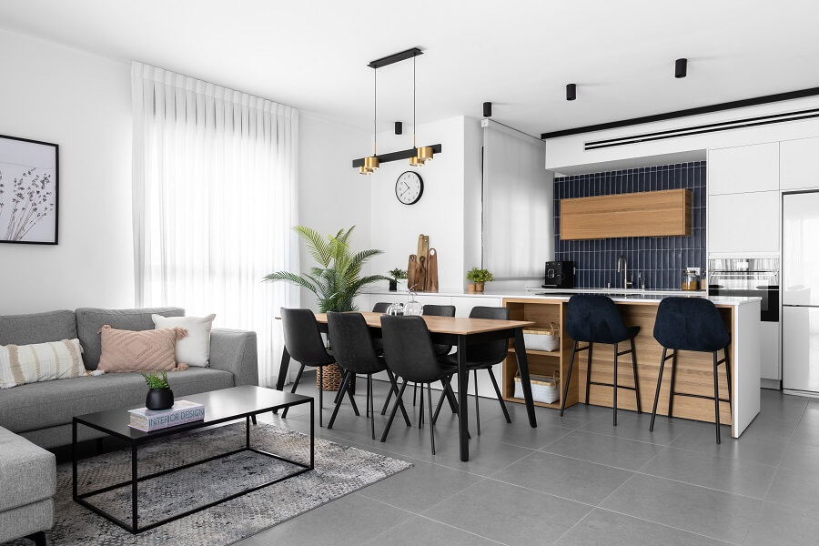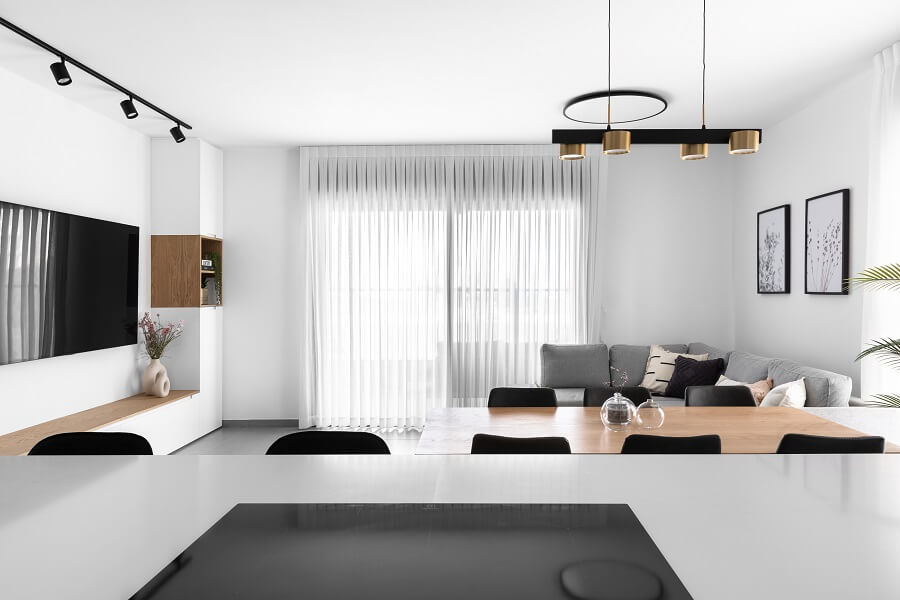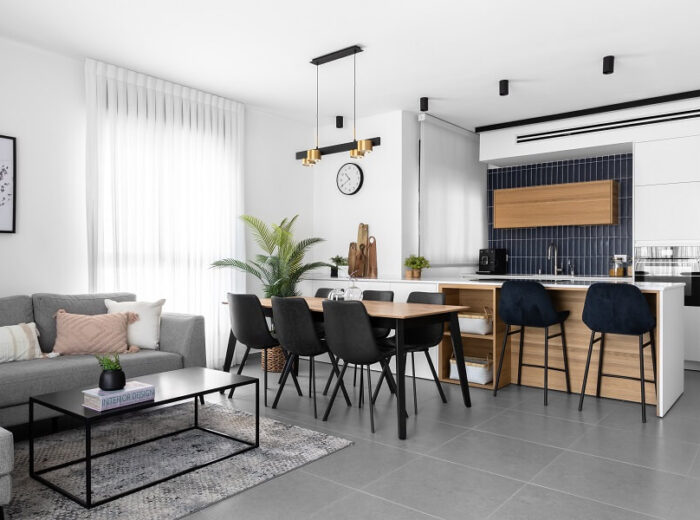 מאחר שמדובר בדירה שנרכשה במסגרת מחיר למשתכן, תהליך השיפוץ החל רק לאחר קבלת המפתח. כיוון שהחלל המרכזי לא היה גדול, הוחלט לבטל את אחד הקירות במטבח. המהלך הזה יצר זרימה ופתיחות, ואפשר לדיירים ליהנות ממטבח מרווח ומסלון שנעים לשבת בו
