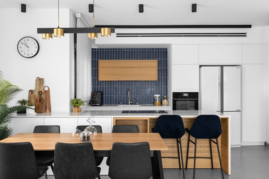 המטבח עוצב תוך חשיבה על הפרקטיות, ותוכננו בו מקומות אחסון ומשטחי עבודה נוחים. כמו כן, שולב שם אי עם אחסון דו-כיווני, שמשמש את הדיירים לארוחות יומיומיות. עבור אירוח של אנשים נוספים, תוכננה פינת אוכל גדולה יותר, שגם יוצרת חיץ בין המטבח לסלון.