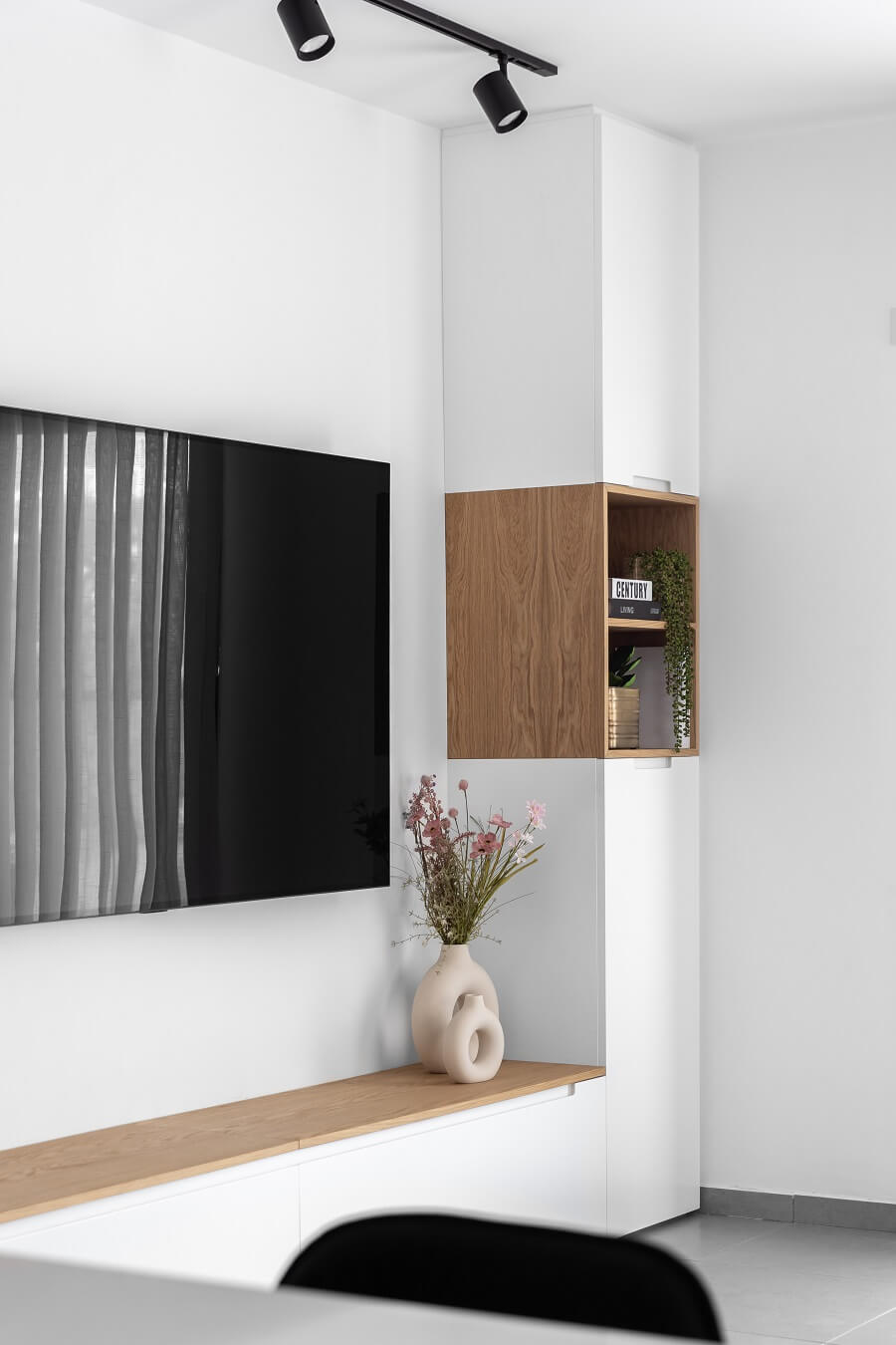 בעיצוב הדירה הוקדשה תשומת לב רבה לתכנון הנגרות. אחד הפריטים המיוחדים ביותר נגלה מיד עם הכניסה לדירה ונמשך עד לחלל הסלון. מדובר ביחידת נגרות שכוללת ארון אחסון סגור למעילים, מדף פתוח שנועד להנחת חפצים קטנים, ופינת ישיבה שהופכת למזנון. בקצה השני של היחידה יש ארון סגור נוסף שמשמש לאחסון מוצרי מדיה שונים.