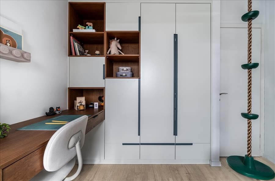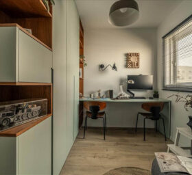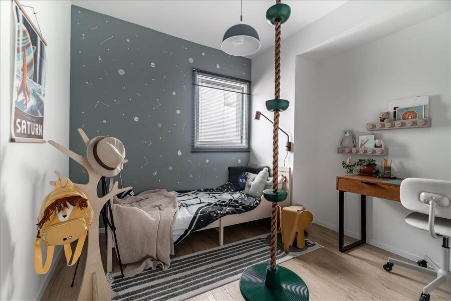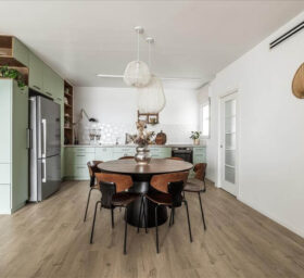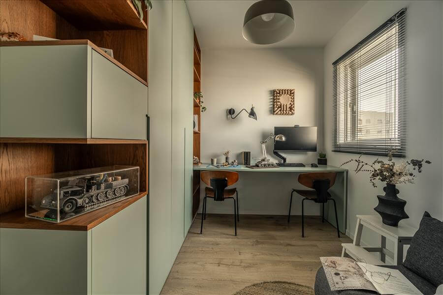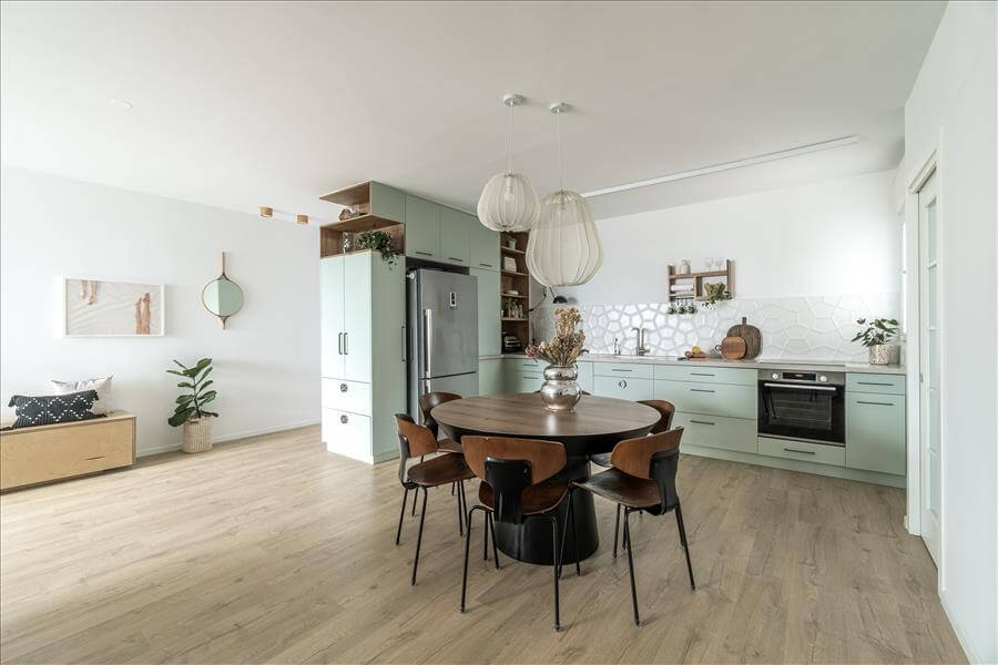 הבית מעוצב בקו מודרני עכשווי, ללא קישוטיות מיותרת, כאשר גווני הירוק- כחול האהובים על הלקוחות מלווים את הדירה כמעט בכל חלל וכך קושרים בין החללים השונים.