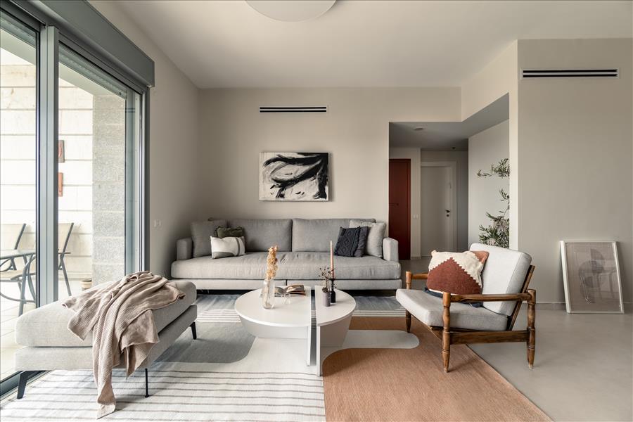 הסלון עוצב בקווים נקיים ופשוטים לשמירה על תחושת המרחב, עם רהיטים נקיים בקווים ישרים ובגוונים טבעיים. הכורסא של אבא של עמוס (בת כ80!!) רופדה מחדש בתאם לפלטת הצבעים