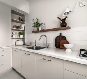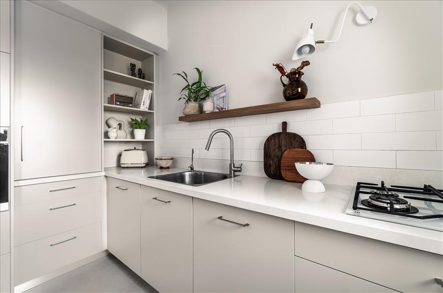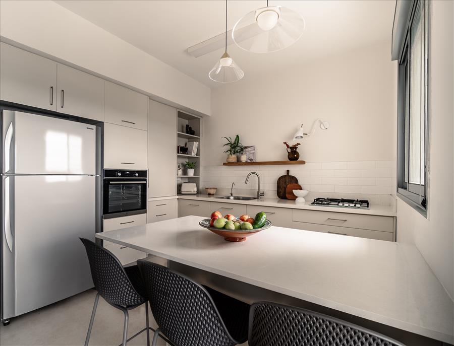 חזיתות המטבח הותאמו לצבע הקירות ויצרו המשכיות ומקום לבשל ולהתרווח, המטבח פתוח, מואר ומושלם לבישול ארוחות משפחתיות, ארוחת בוקר קלה ולכוס קפה עם חברים. המטבח מתחבר לסלון, כך שכשמבשלים, מרגישים חלק מהמרחב המרכזי של הדירה.