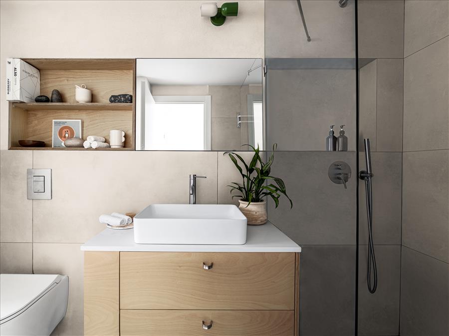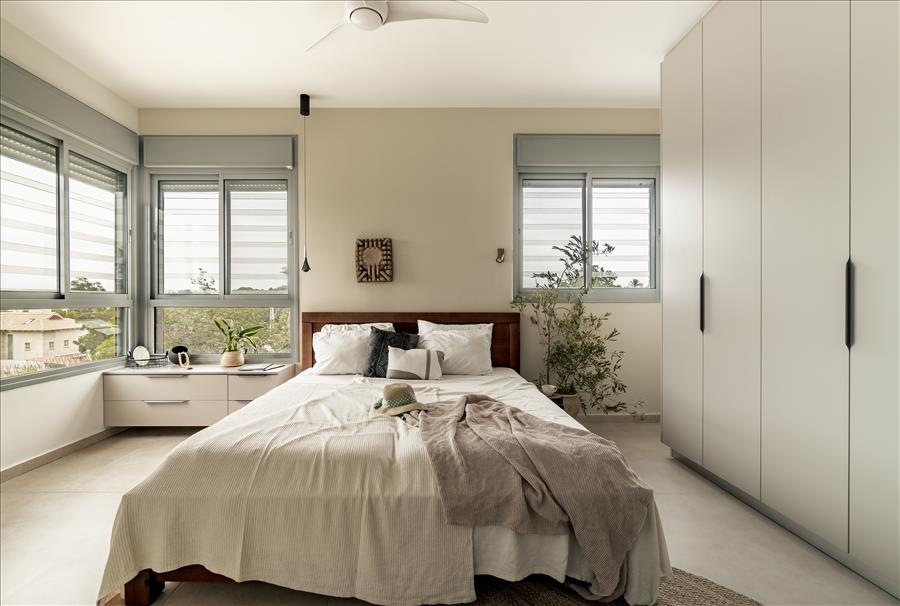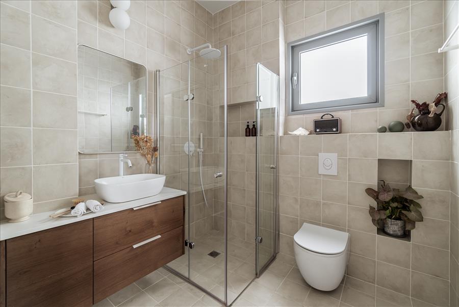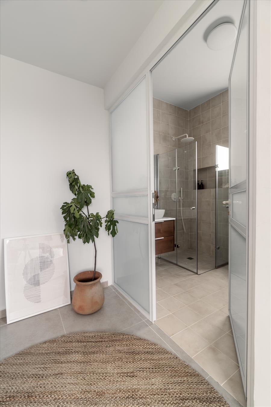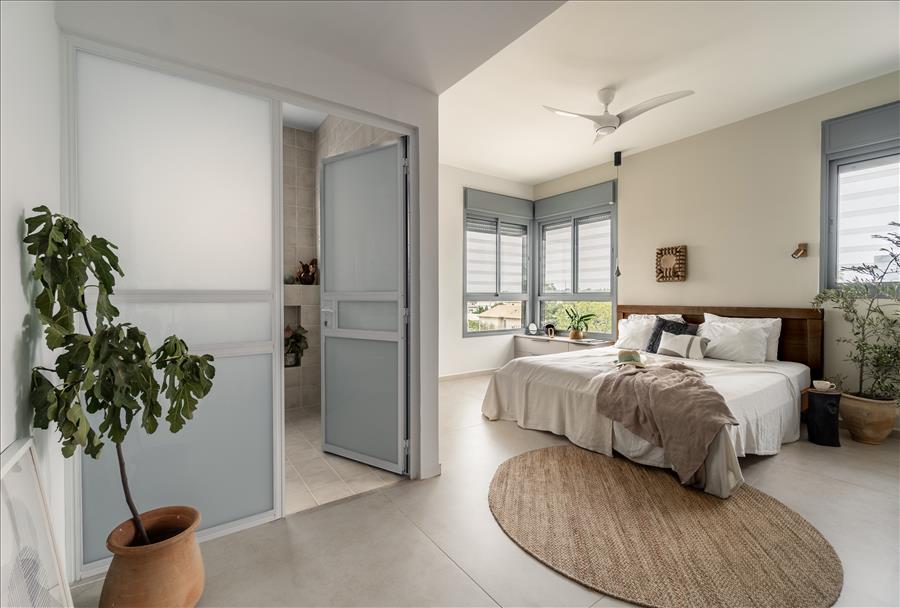 חדר השינה, מוקד השקט, עוצב עם דלת זכוכית במקלחת, שמכניסה אור טבעי ומוסיפה עוד יותר תחושת מרחב. המקלחת עצמה חופתה באריחים בגוונים טבעיים וכל פרט נבחר בקפידה כדי ליצור מקום של רוגע ושלווה בסוף היום.