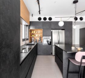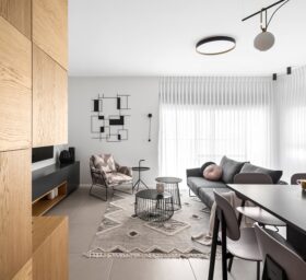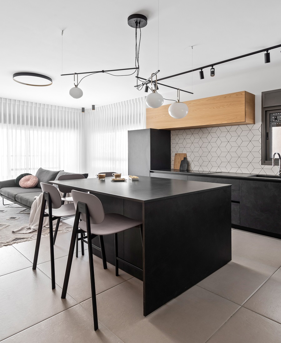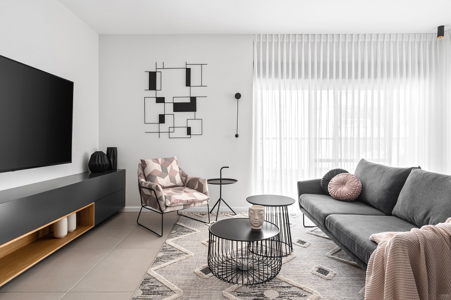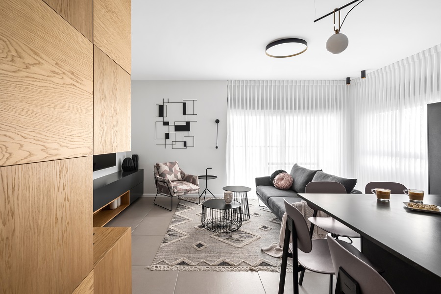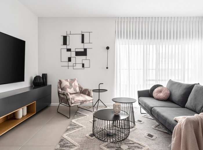 כיוון שזו דירת קבלן-הפרויקט ארך כשלוש שנים, שבהם ליוויתי אותם החל משינויי קירות דרך תכנון ריהוט והלבשת הבית.