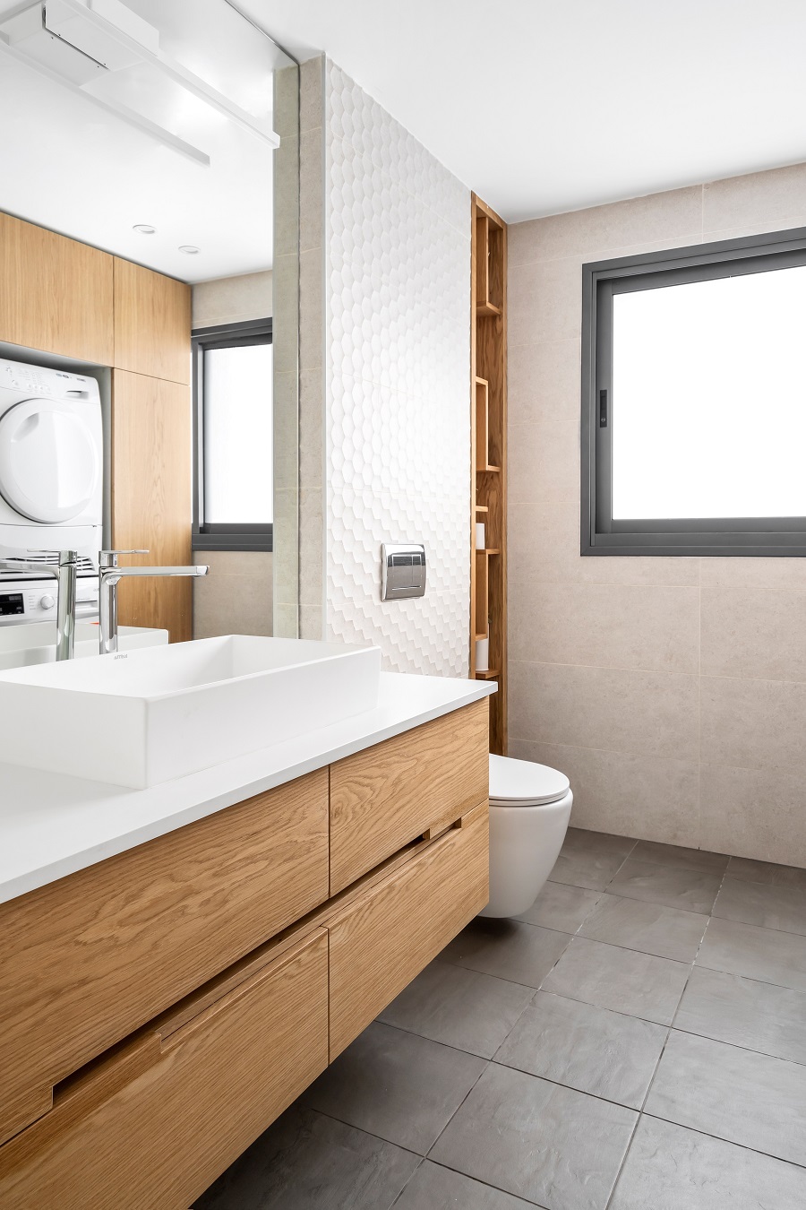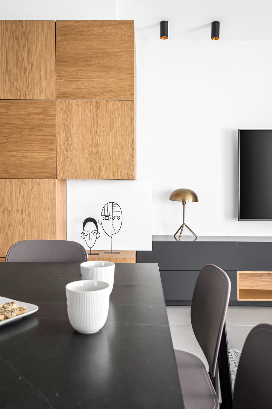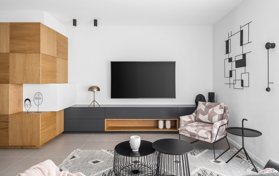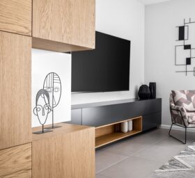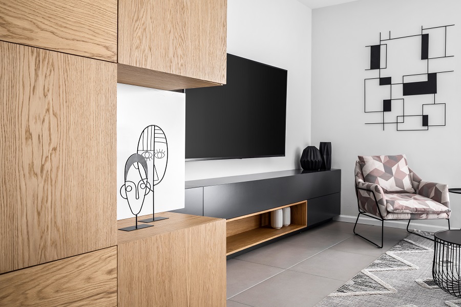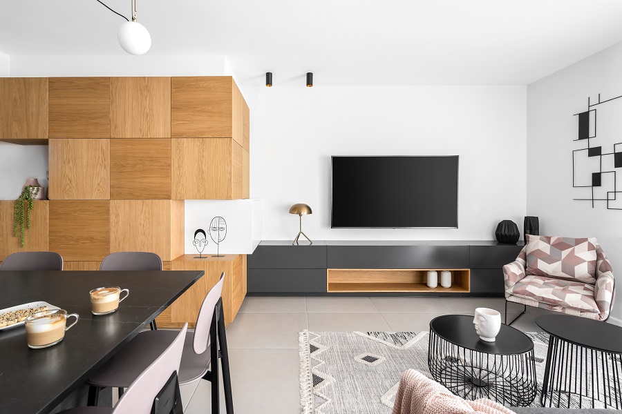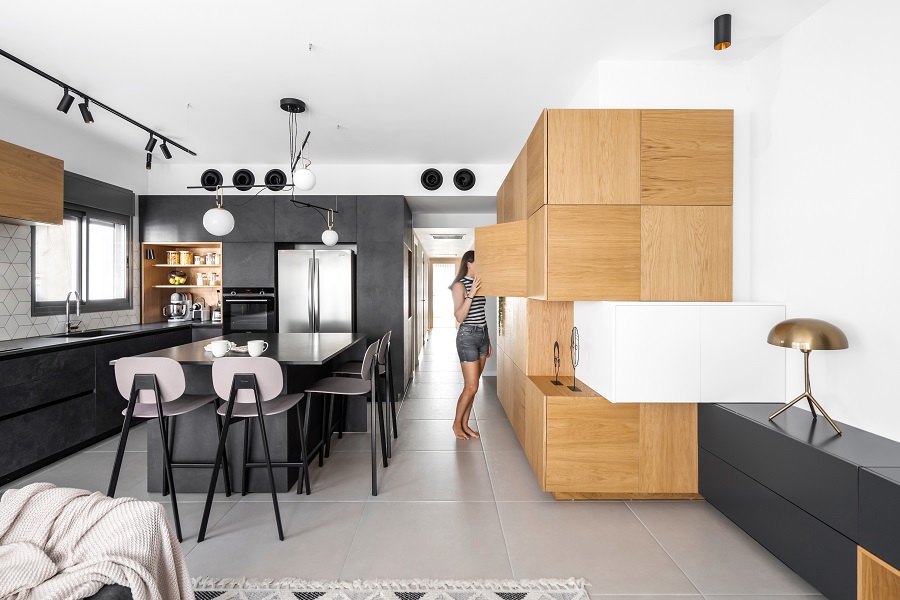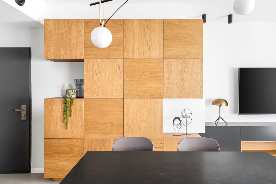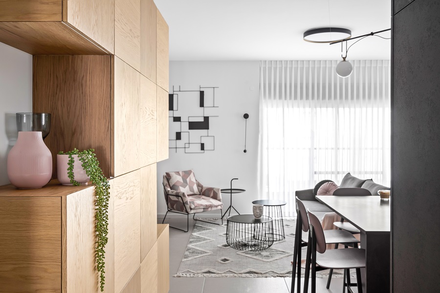 כיוון שהדירה לא מאוד גדולה ואין לה מחסן, הוספתי בכניסה לבית ארון קוביות מעוצב שמכיל הרבה אחסון ותורם מאוד לעיצוב החלל.