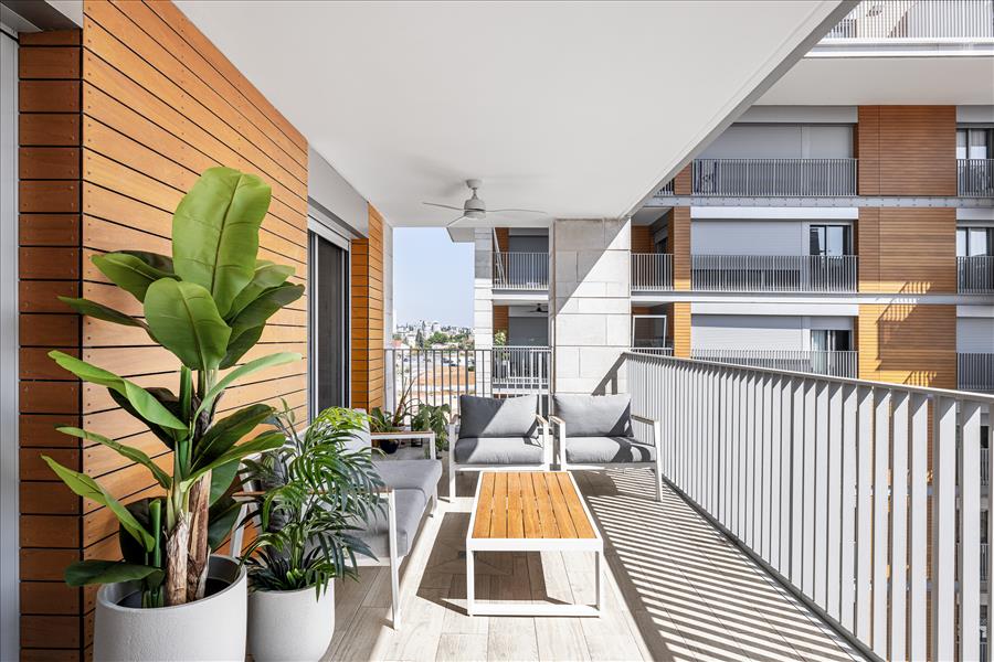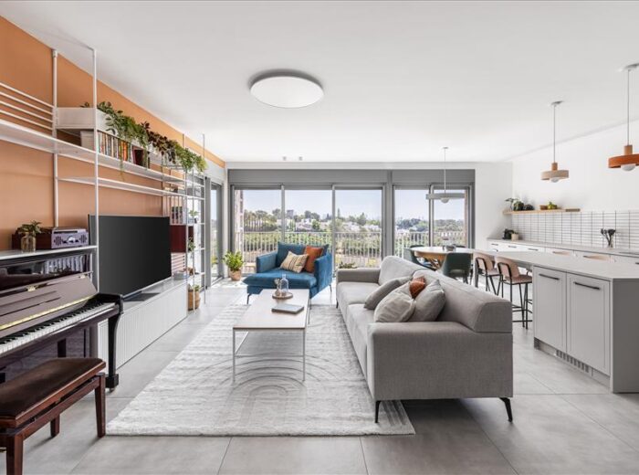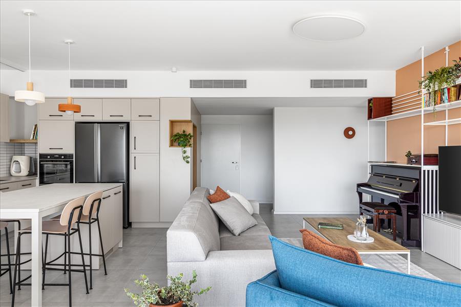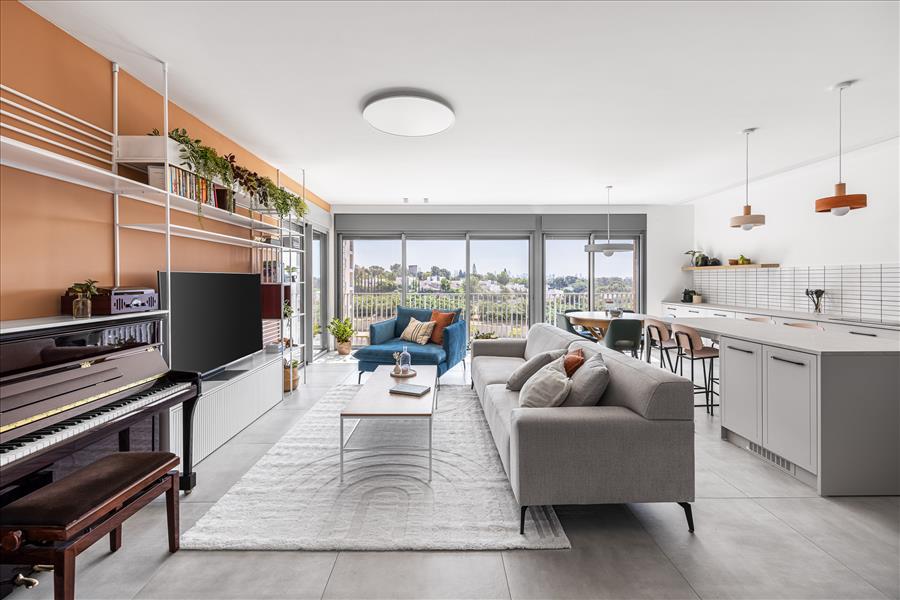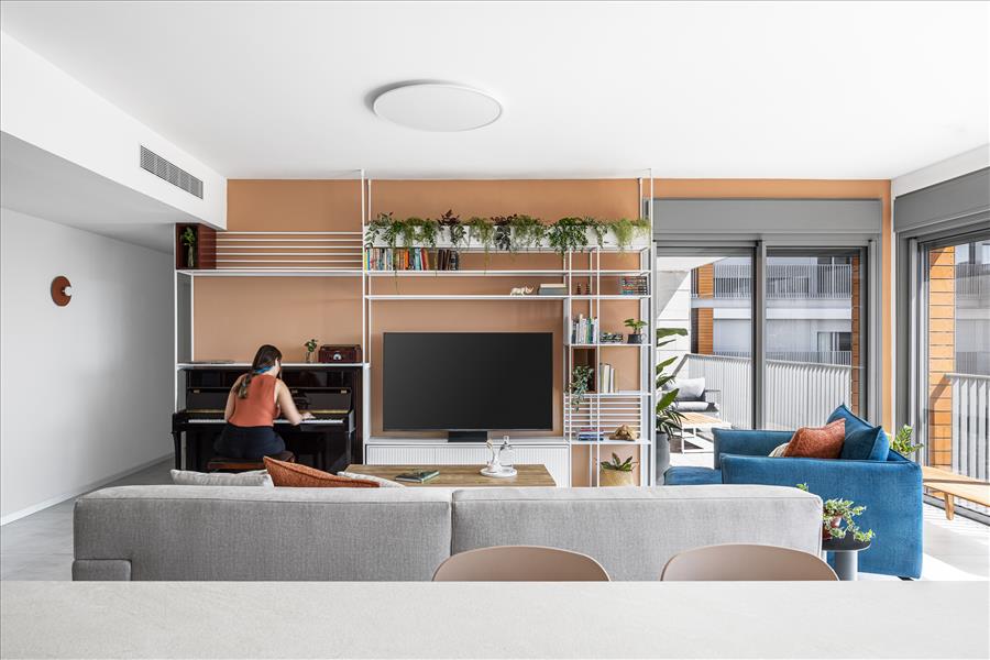 הסלון, לב הבית, קיבל טיפול מיוחד עם ספריית ברזל לבנה ומרשימה שמעניקה מקום של כבוד לפסנתר עתיק שעובר במשפחה מדור לדור, נקודת חיבור מרגשת בין עבר להווה.