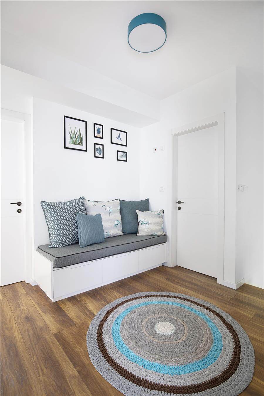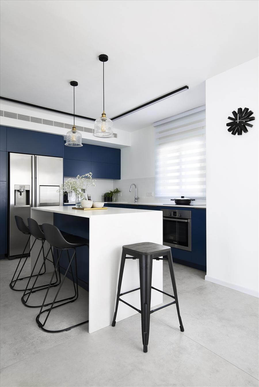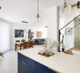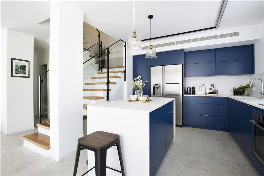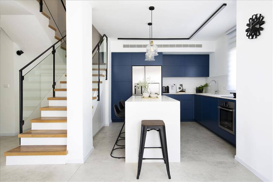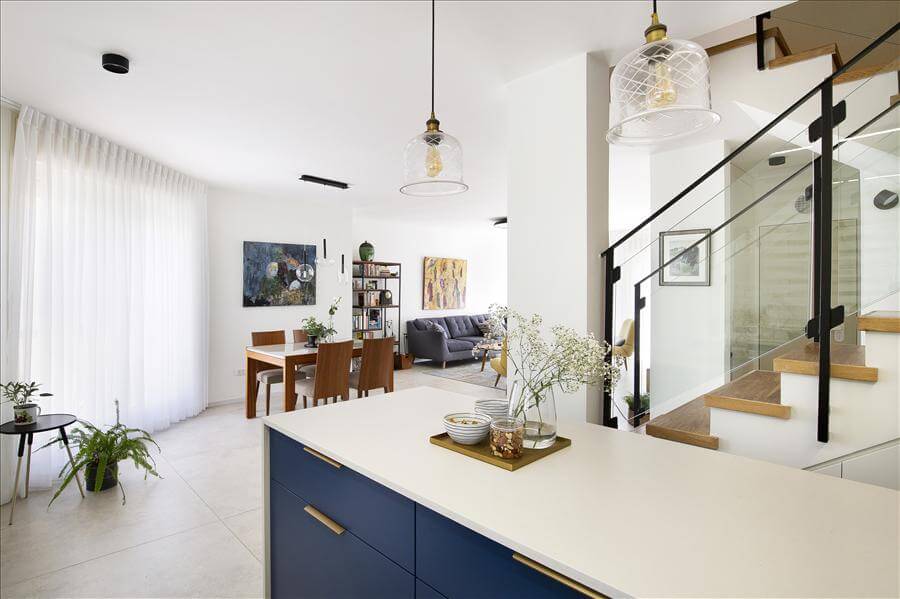שיפוץ נרחב לדופלקס שהתחיל ברצון לעדכן את המטבח שהיה קטן וסגור, הקיר שהפריד בינו לבין החלל הציבורי נפתח, וכך גם בוטל הקיר הגובל במדרגות. הלקוחות מאוד רצו מטבח כחול, וסביב הרצון הזה בוצעו הבחירות. בנוסף נבחר ריצוף גדול לבית, להדגיש את תחושת החלל.