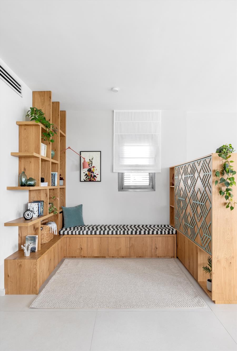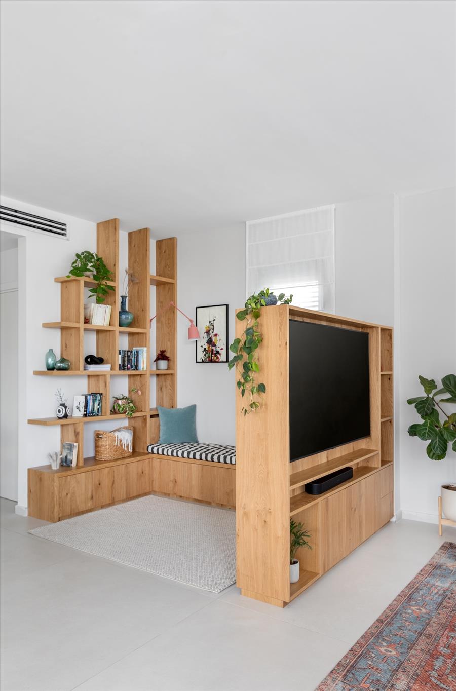 אזור צפייה בטלוויזיה ואזור משחק לילדים וקריאת ספרים עם ספסל מפנק והרבה אחסון.