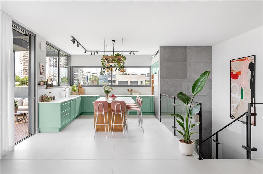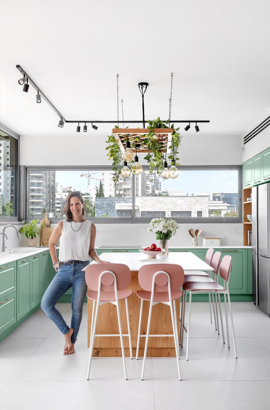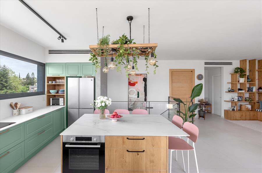 שדרגנו את המטבח הקיים עם חזיתות חדשות בגוון ירוק מרענן, אי חדש ונגיעות של עץ.