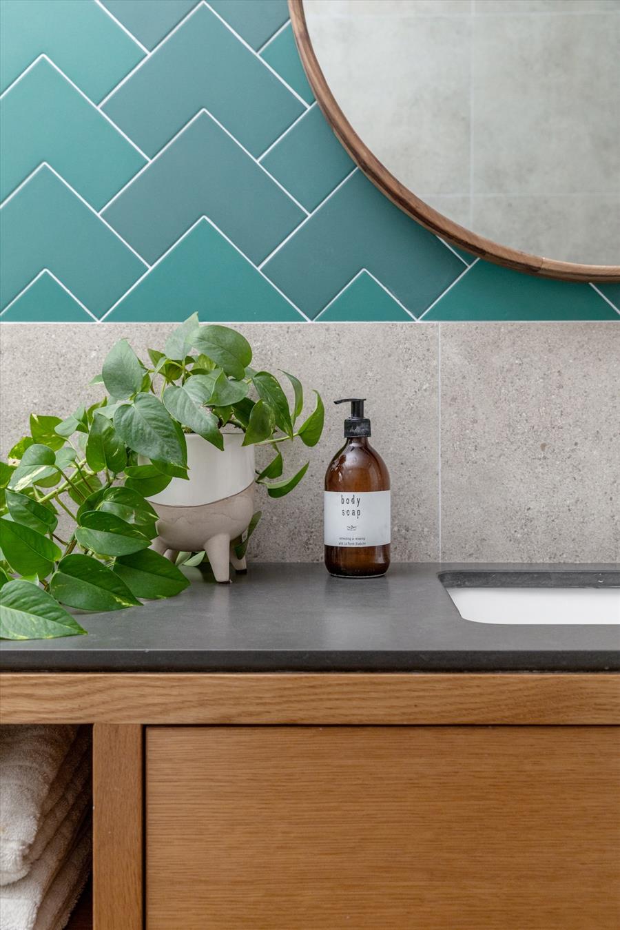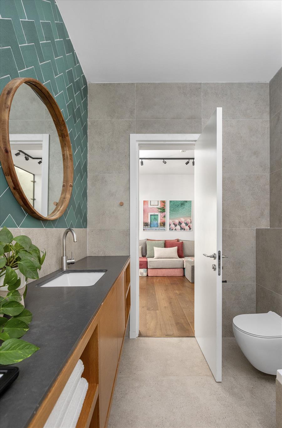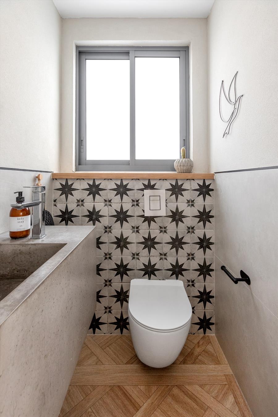 בשירותי האורחים ובחדר רחצה ילדים החלפנו את הריצוף והחיפויים הכהים לחיפויים עם טקסטורות, צבעוניות ופטרנים התואמים את העיצוב הצעיר והצבעוני של הבית.