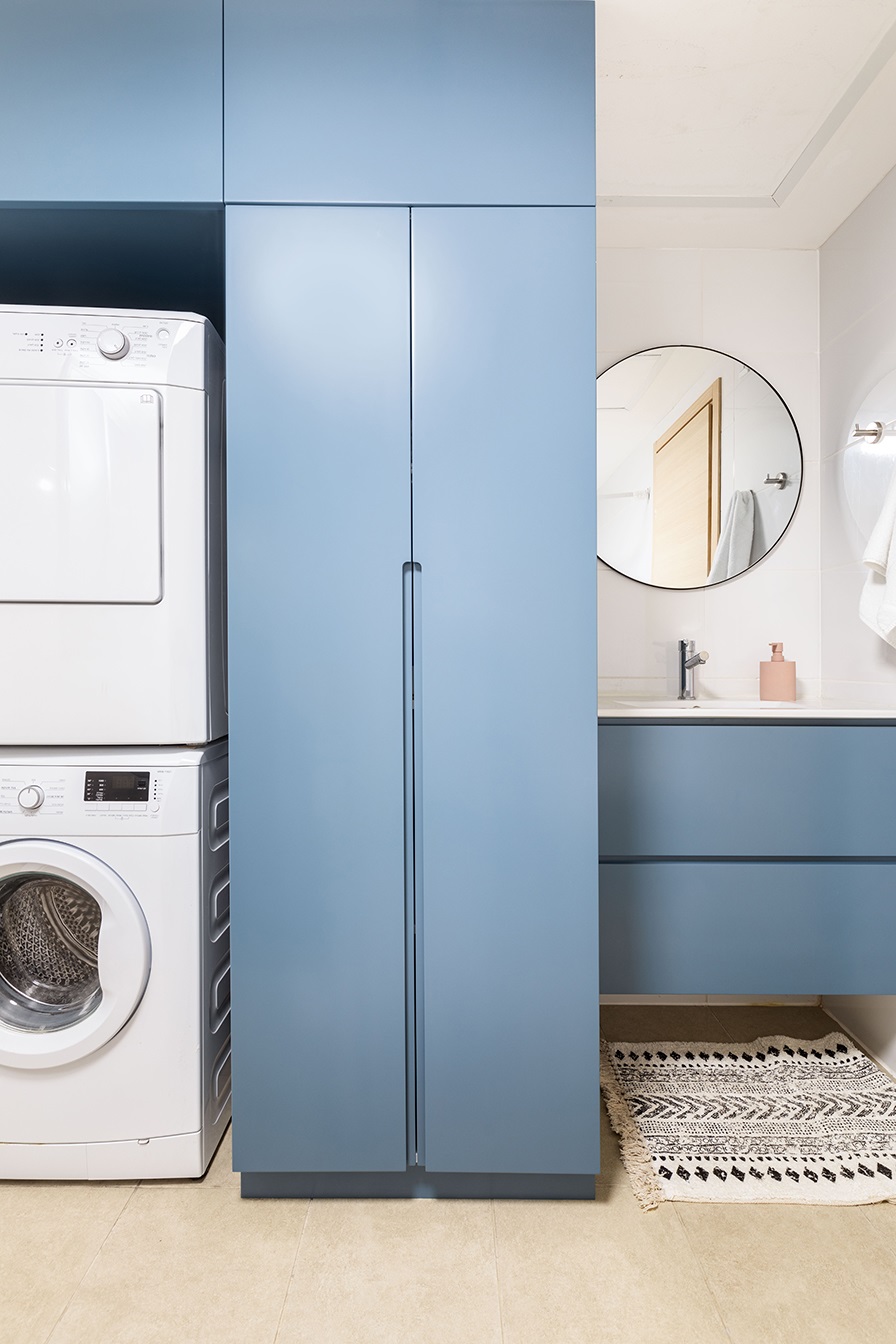 חדרי הרחצה שלא עברו שיפוץ מטעמי תקציב, שודרגו עם נגרות ייעודית של ארונות רחצה, משטח שיש, כיורים וברזים חדשים שעושים את ההבדל הגדול.