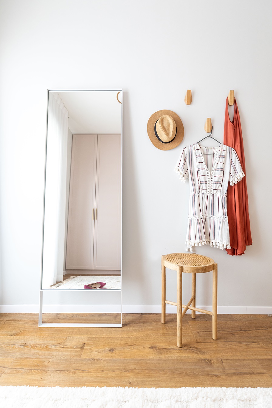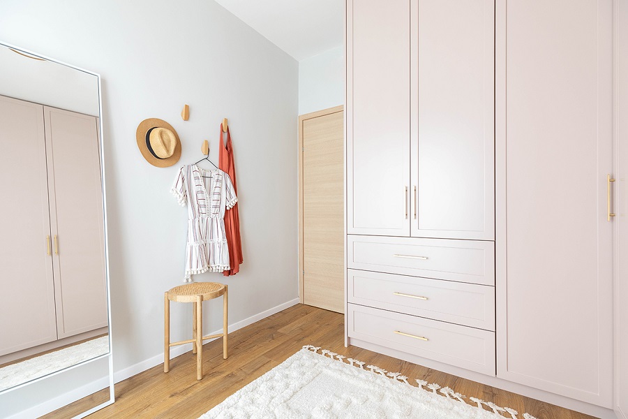 לחזיתות הארונות בחרנו בגוון ורוד ניוד ויחד עם ידיות פליז, קיבלנו חדר נוטף שיק וסטייל.