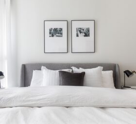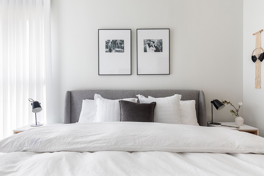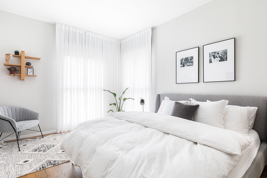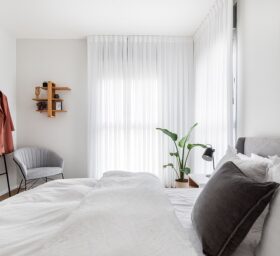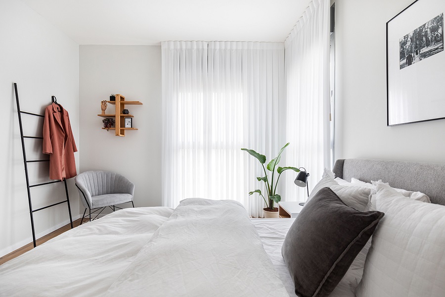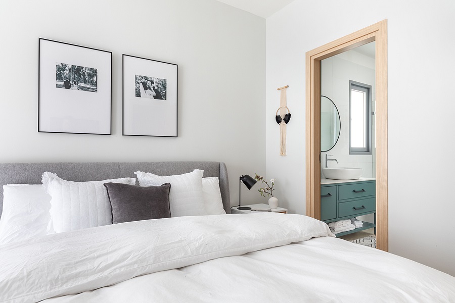 חדר השינה ממשיך בקו של חדר הארונות הסמוך, מלא רוך ואלגנטיות, בקווים נקיים ובגוונים בהירים בשילוב של טקסטיל מחמם.