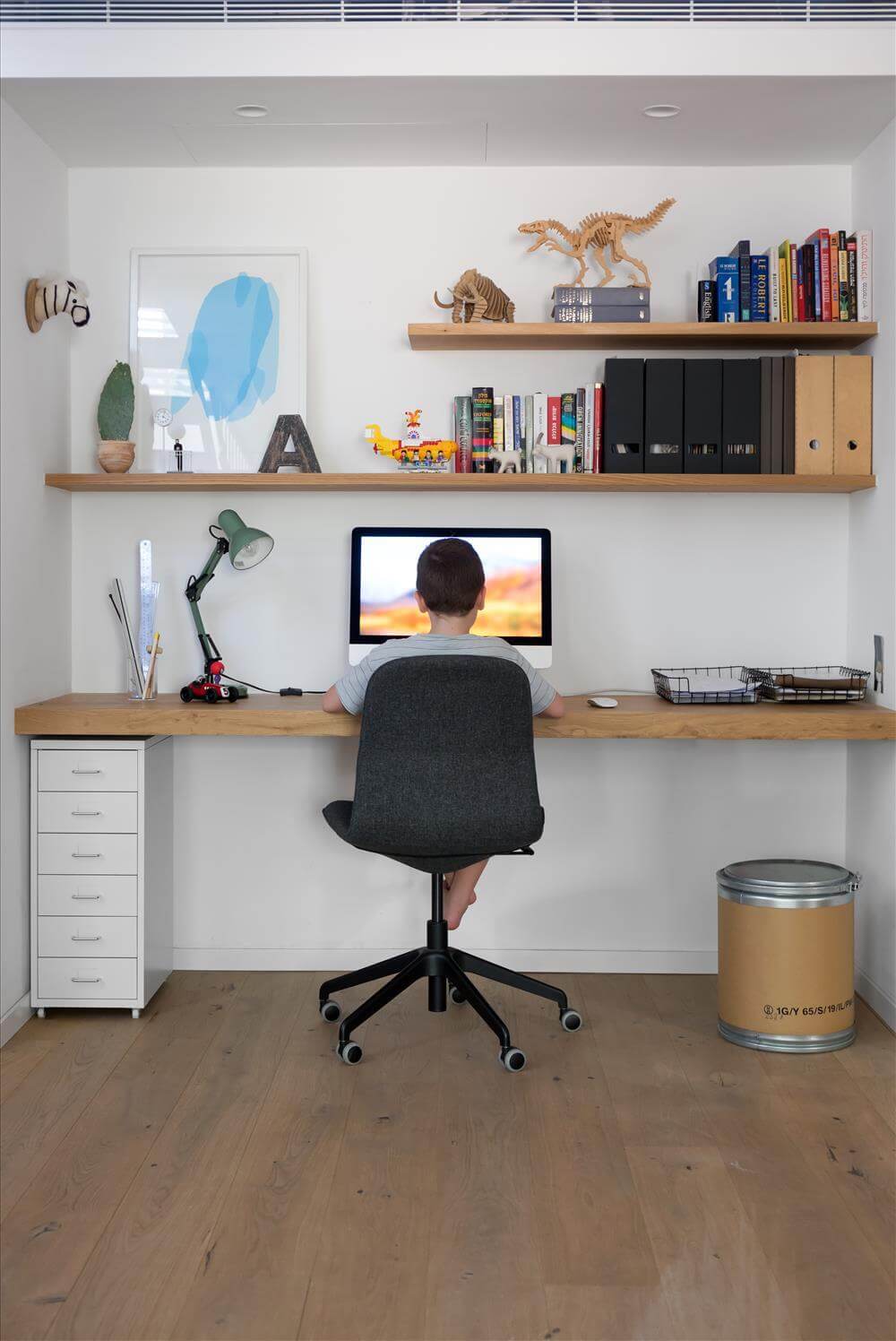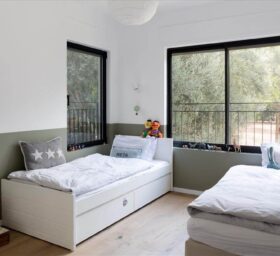 אז קומת הכניסה לבית היא דוקא העליונה, שם יש מטבח, פינת אוכל, סלון גדול, ש.אורחים ומרפסת שמשקיפה לחורשה הכי יפה ברמת אביב.בקומה התחתונה, יש את הממד שכרגע משמש כחדר משחקים שלא היה מבייש סניף של טויז אר אס, פינת מחשב כפולה, קיר טיפוס עם חבלים ונדנדות, חדר לשני הבנים, חדר לשילה היפה, רחצה לילדים ומאסטר הורים מפנק.